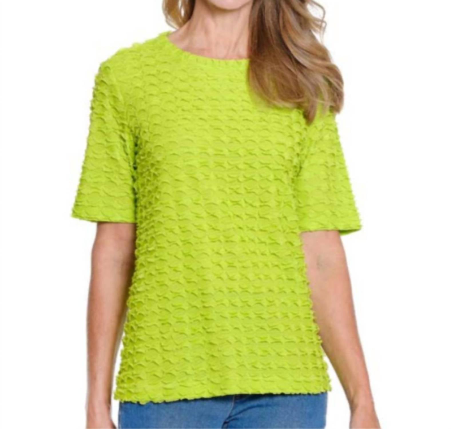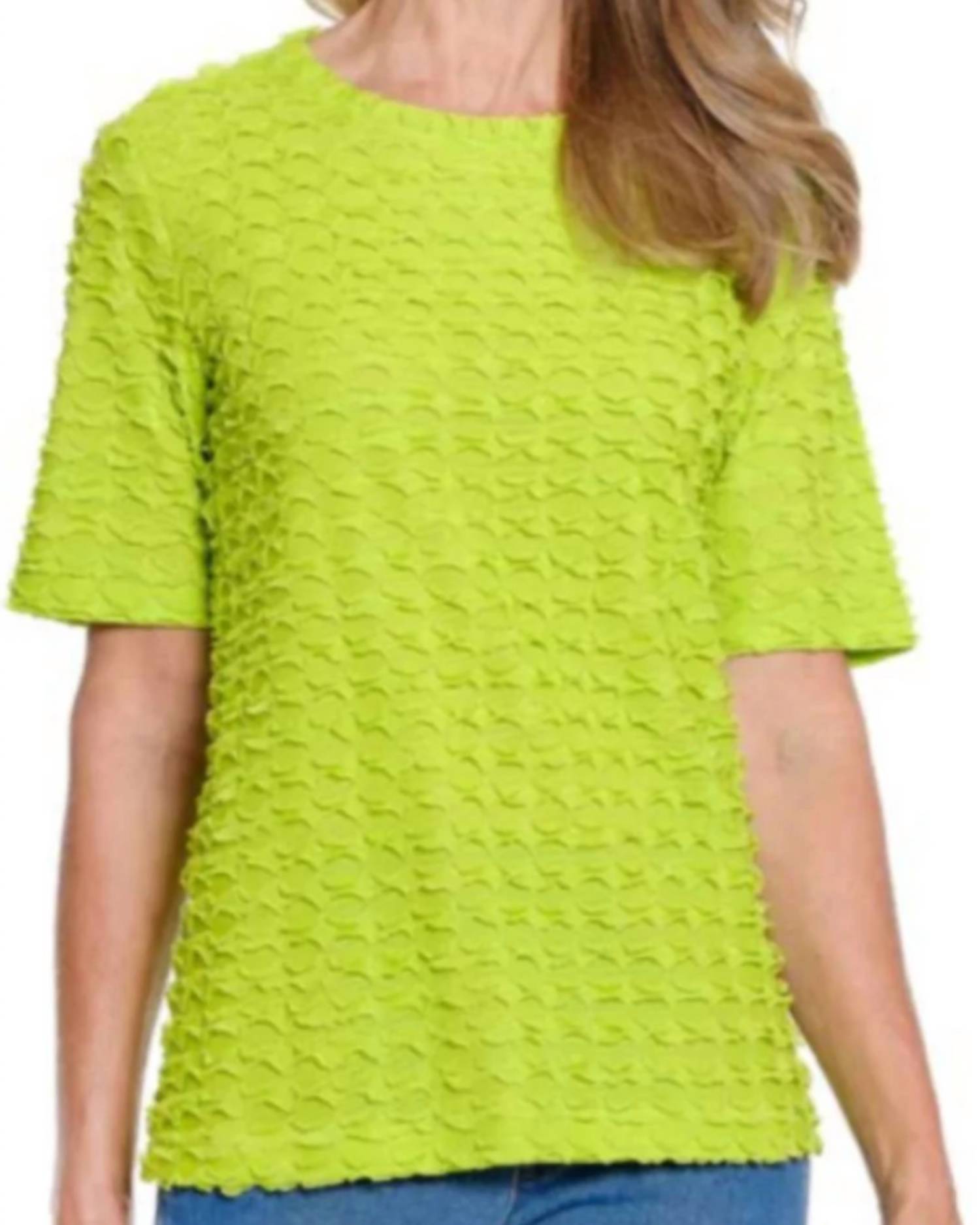 A versatile blouse that works from desk to dinner! Experience the vibrant allure of the Elbow Sleeve Ruffle Top by Multiples in Neon Lime, a statement piece that epitomizes modern style. With its elbow-length sleeves and distinctive textured wave knit, this polyester top offers a sleek fit perfect for any occasion. The banded scoop neckline enhances its polish, while the pull-on closure ensures effortless wear. Ideal for your vacation wardrobe and embracing the maximalist trend, this trendy blouse promises to be a stylish spring staple.