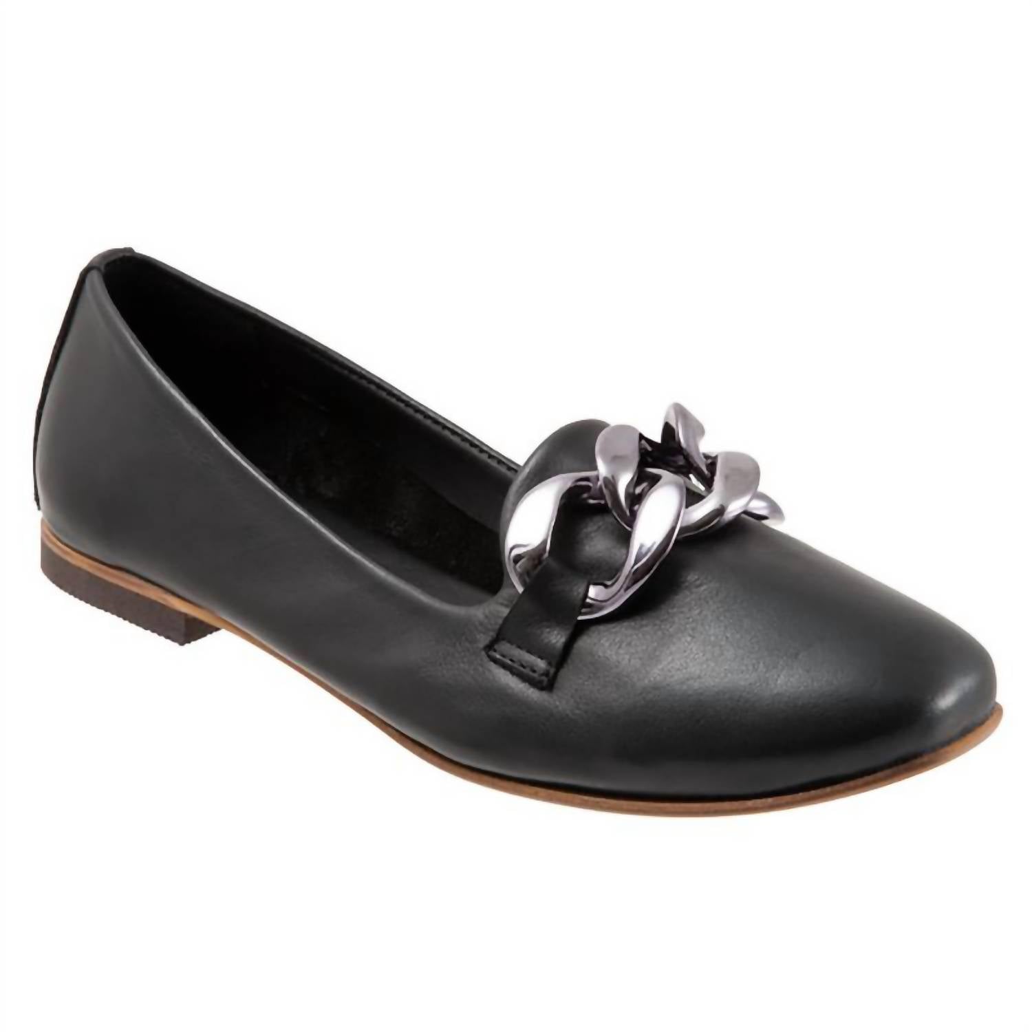 A preppy yet feminine take on the classic loafer. Elevate your everyday style with the Women's Aston Flat by Bueno, a chic black shoe featuring a large chain ornament on the vamp. Crafted with a leather upper and leather lined footbed, these flats offer a luxurious touch. The flexible sole is made from thermo rubber compound, while the design includes a 1/2" heel height and round toe shape for added comfort. Perfect for women seeking a blend of elegance and versatility.