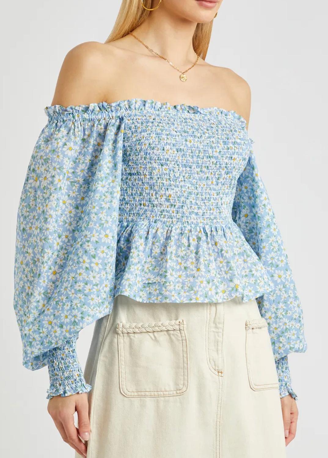 A timeless blouse that will never go out of style. Introducing the Eloise Top by RIXO, a stunning choice for your summer vacation wardrobe in a captivating Blue Daisy floral pattern. This off-the-shoulder blouse features long balloon sleeves and elasticated smocked panels at the front and cuffs, paired with elegant ruffled trims and a pleated flared hem. Made from 100% cotton, it ensures comfort and breathability. Closure: Pull on. Care instructions: Not available.