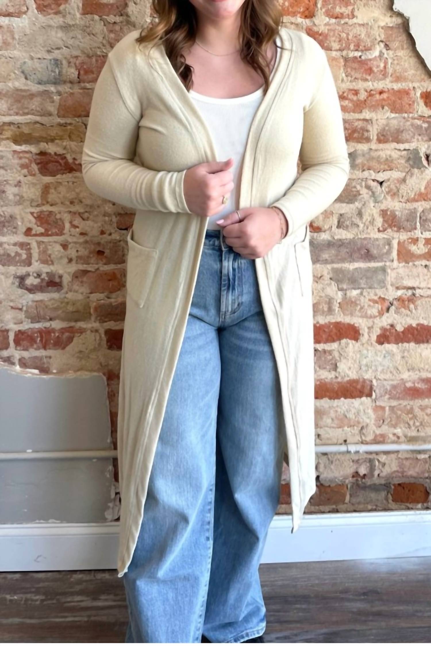 This cardigan will be a sweater-rotation favorite. The Woodland Escape Cardigan by ELAN is an essential for your fall wardrobe, combining timeless design with versatility. This women's cardigan comes in a neutral yellow hue and features a textured pattern with long sleeves and an open neckline. Crafted from a blend of 79% polyester, 18% rayon, and 3% spandex, it ensures a soft and lightweight feel. This pull-on cardigan is easy to style and promises both coziness and elegance. Model is 5'6" and wearing a medium.