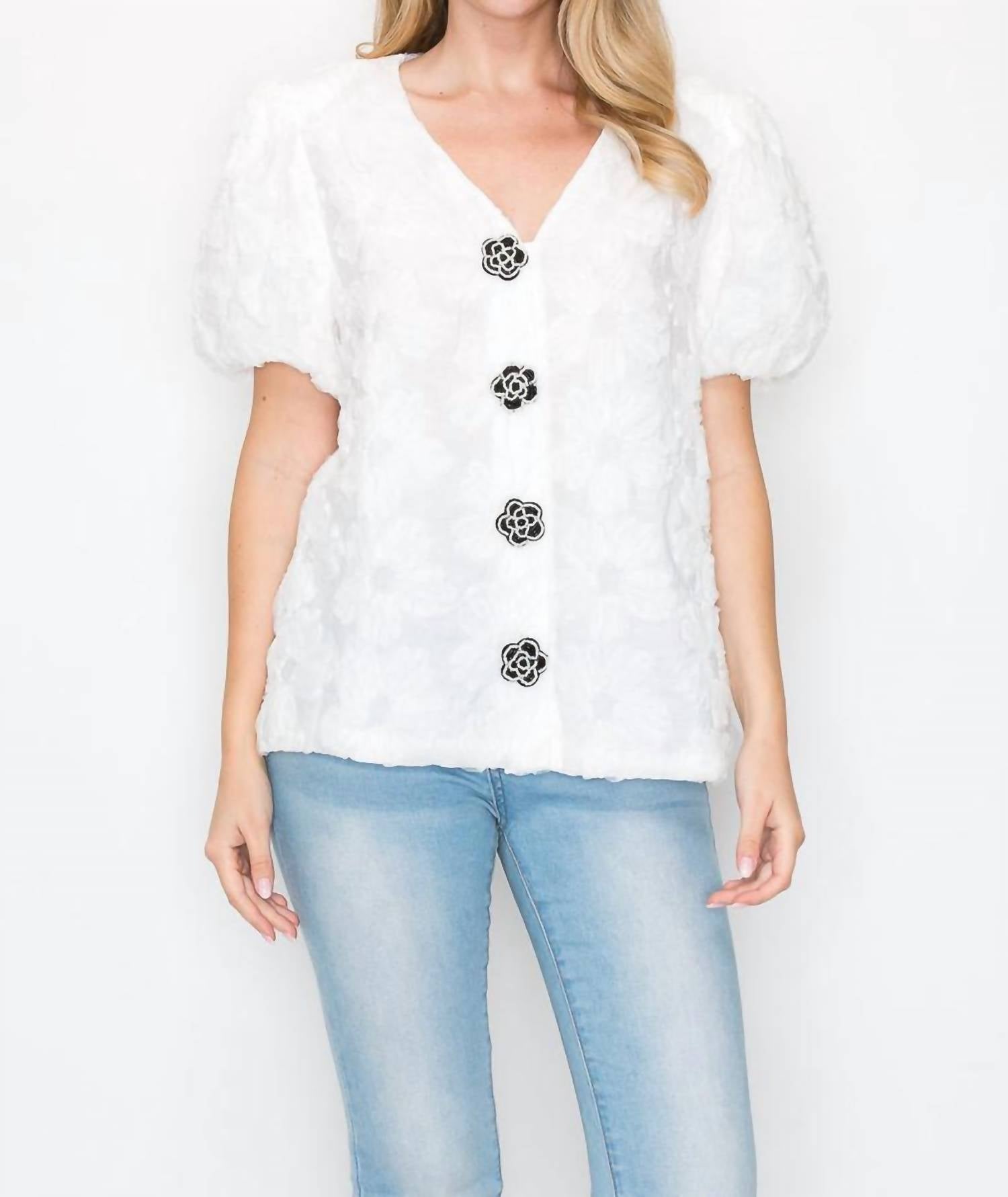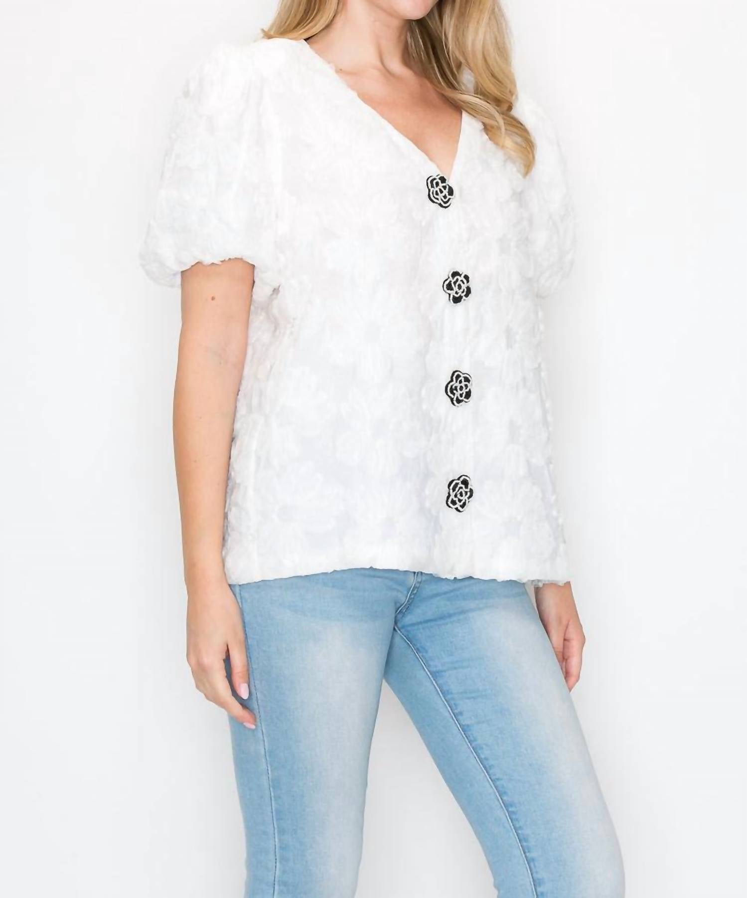 Pair this with your favorite jeans and slides for your next girls night out. Meet the Wendy Top by JOH, a sweet and lovely addition to your wardrobe. Crafted in white with textured woven lace, it features a front V-neck and slightly puffed short sleeves for a feminine touch. This stylish blouse boasts a relaxed fit with charming flower button closures. Embrace chic elegance with this timeless piece.