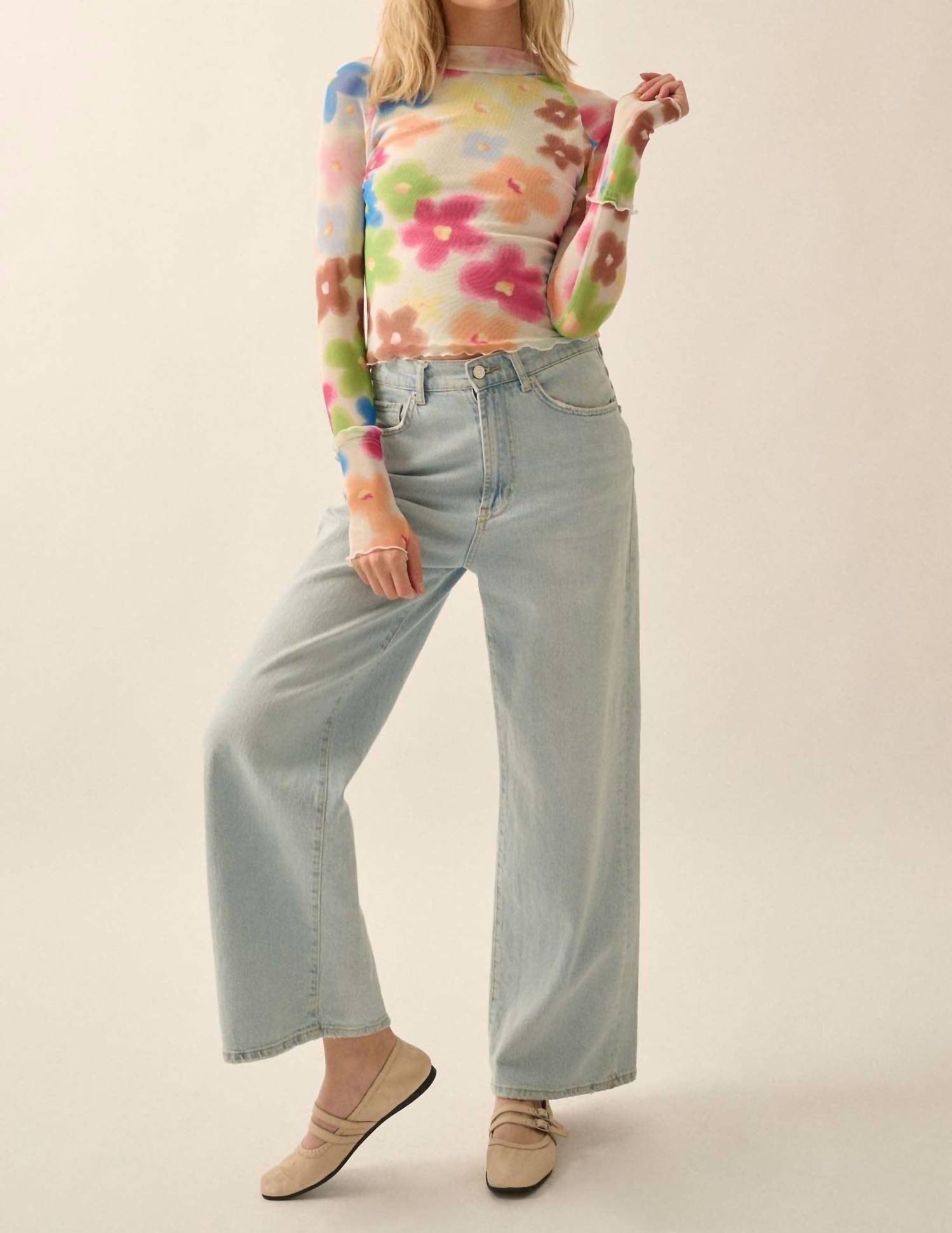 Show a little skin in this cute and casual crop top. Boho chic crop top in a dreamy floral print. Multicolor piece features long raglan sleeves with lettuce-edge cuffs and thumb holes, a high neckline, and a sleeveless lining. Made from 95% Polyester and 5% Spandex. Fitted silhouette ensures a perfect stretch and a comfortable fit. Machine wash. Model is wearing a size small. Ideal for spring holidays or parties.
