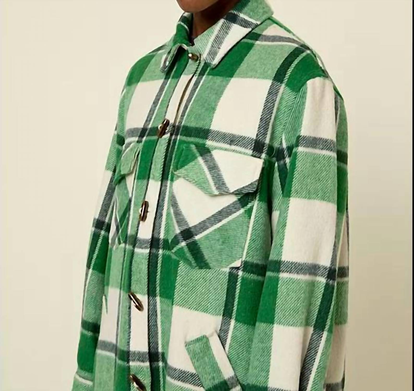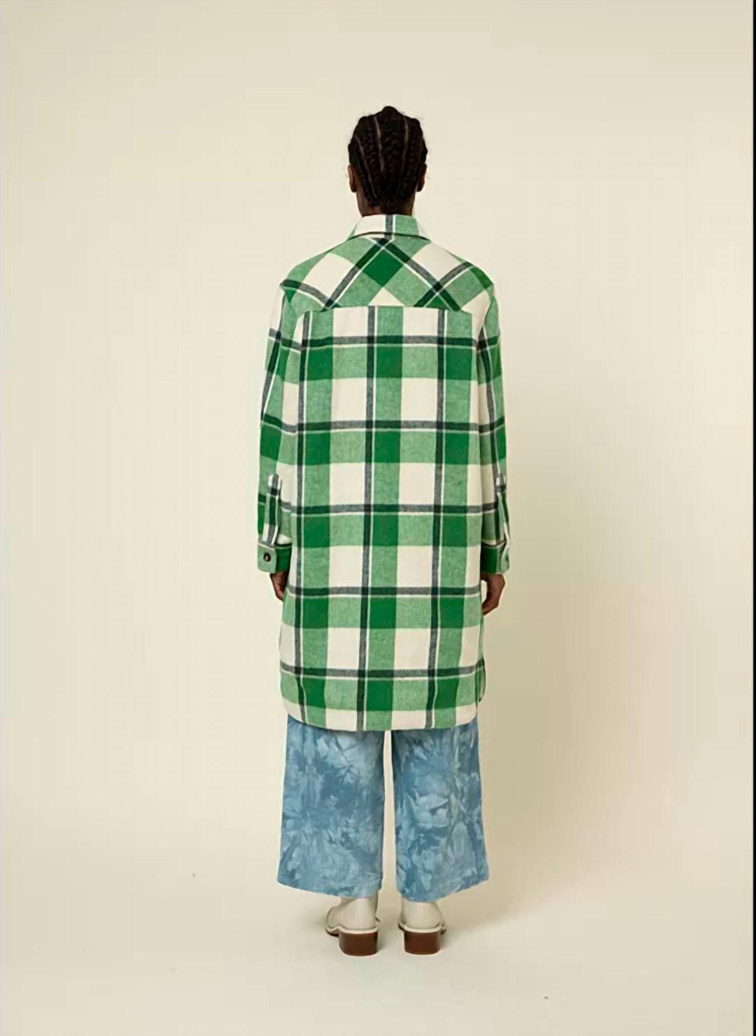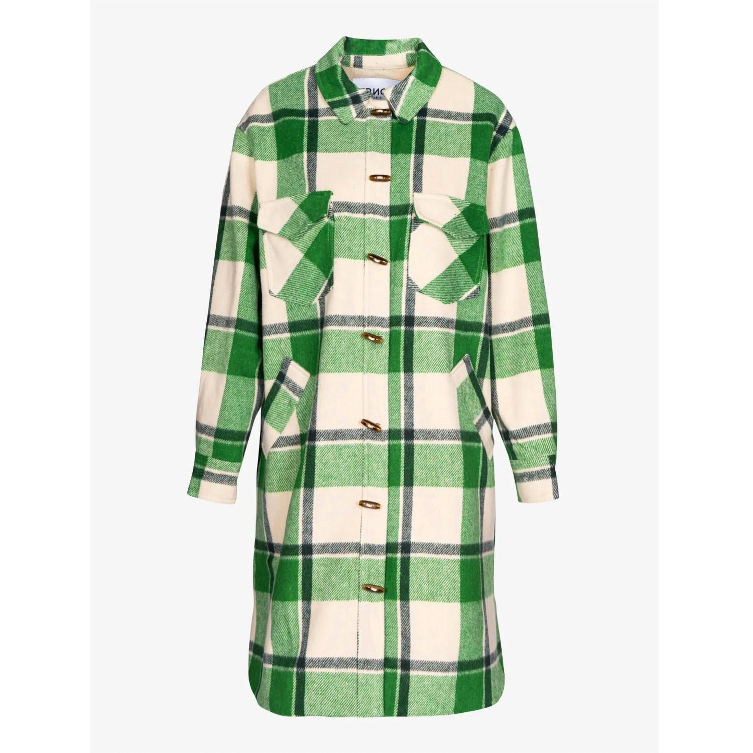 A casual yet cool jacket that every closset needs. Elevate your outerwear collection with the Solar Woven Coat by FRNCH, a chic reinterpretation of the classic trucker jacket in a cozy, longer cut. Crafted from a cotton blend, this plaid and check coat in green boasts long sleeves, a shirt collar, and practical chest and side pockets. It features a button closure and is fully lined, ensuring both style and comfort in cooler weather.