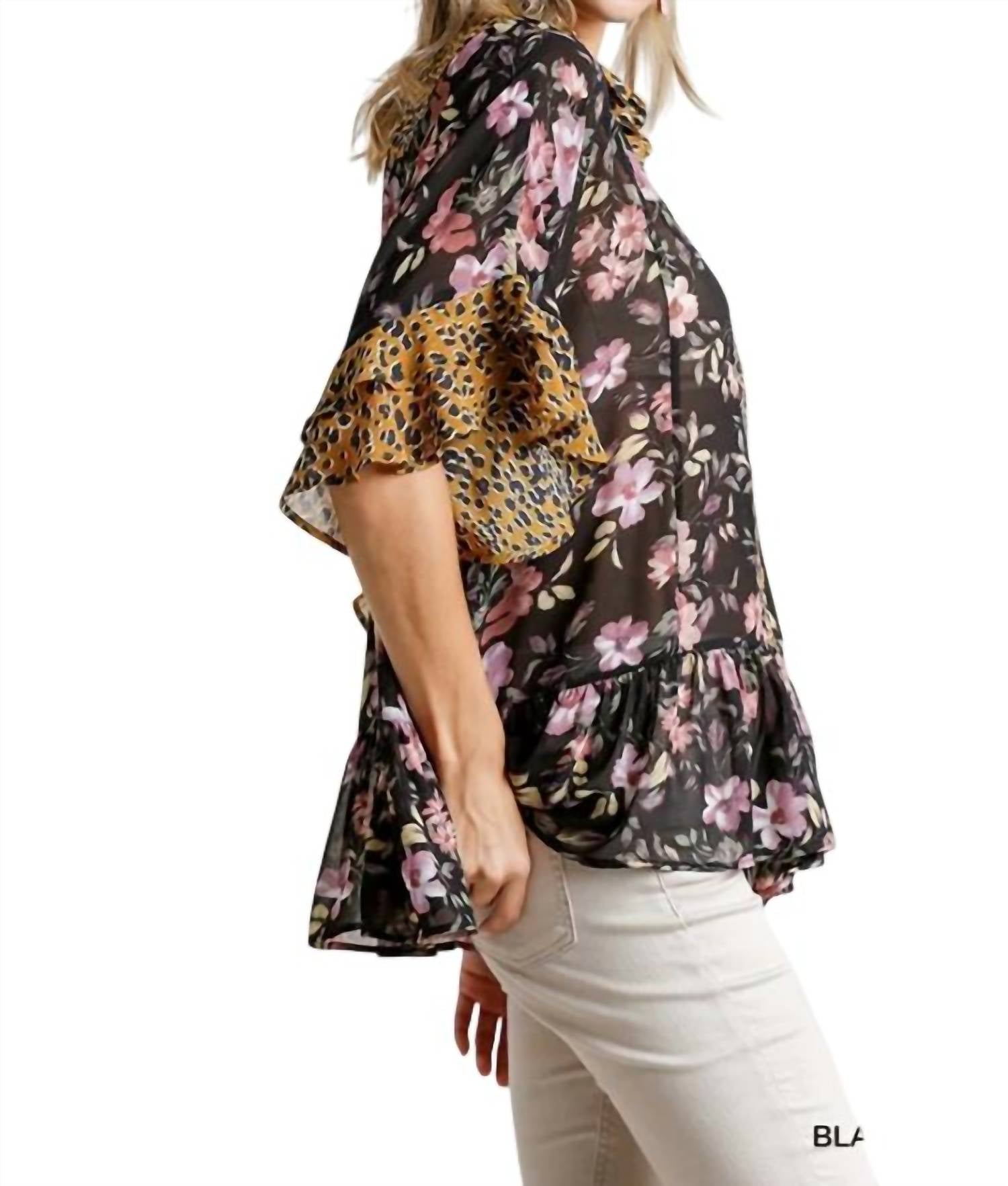 Introducing the Floral & Animal Print Top by Umgee, a truly stunning blend of sheer floral and animal prints perfect for making a bold statement. This blouse features elbow-length layered bell sleeves and a ruffled hem, ensuring a full-cut pullover silhouette that is both elegant and playful. Crafted from 100% polyester, it boasts a classic collared neckline with a partial button closure for easy wear. With dimensions available for various sizes, this piece is imported and requires hand washing for optimum care.