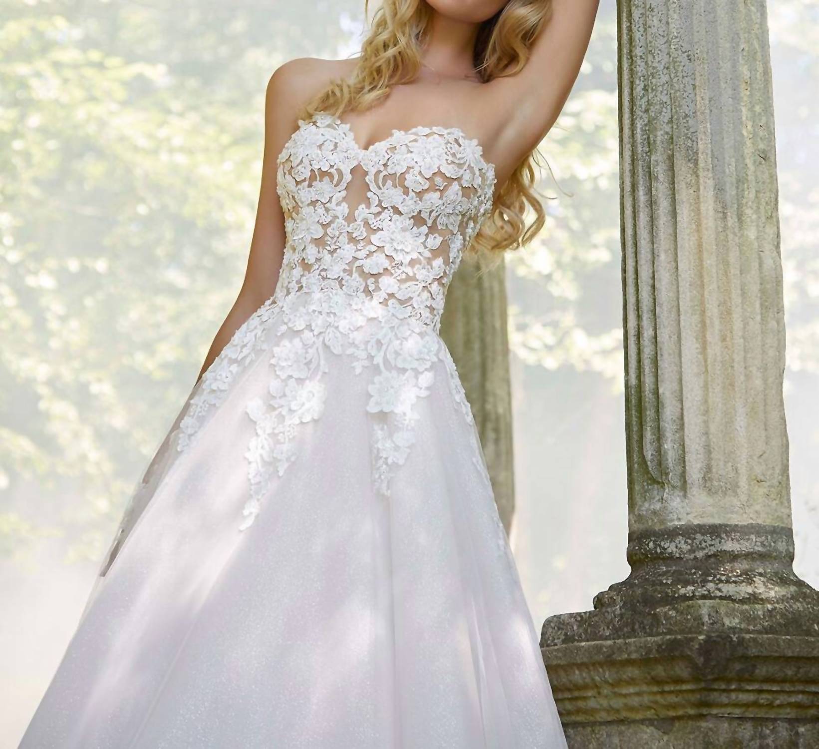 Designed for the bride who values understated elegance. Its classic design and perfect fit make it the ideal choice for your special day. Say yes to the dress! Discover the Pierette Strapless Wedding Dress by MORILEE, a breathtakingly elegant piece in an enchanting ivory/crème palette. This textured ballgown boasts strapless, off-the-shoulder sleeves and showcases exquisite pearlized beading on three-dimensional embroidered lace appliqués over delicate English net, layered with glitter net for added sparkle. Button closure. Perfect for making your wedding day unforgettable.