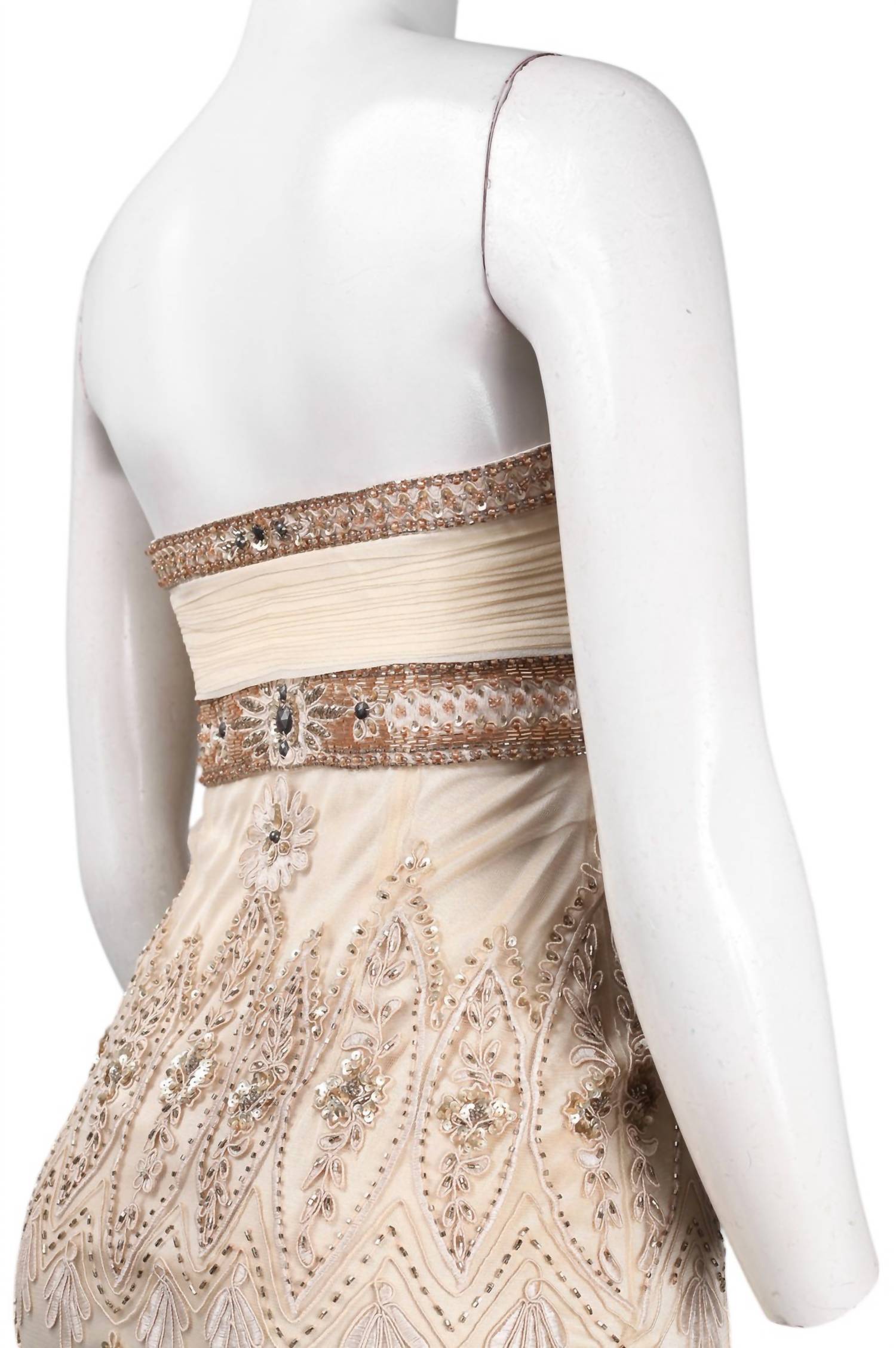 The perfect mini dress for those warmer months. Unveiling the Strapless Ruched Embellished Empire Dress by Sue Wong, a captivating piece that exudes elegance in champagne. This strapless mini dress features an empire waist silhouette with a ruched bust and embellished pattern, crafted from 100% nylon mesh with a 100% polyester lining. Designed for effortless wear, it secures with a side zipper. Perfect for chic occasions, this dress is a must-have for any fashion-forward wardrobe.