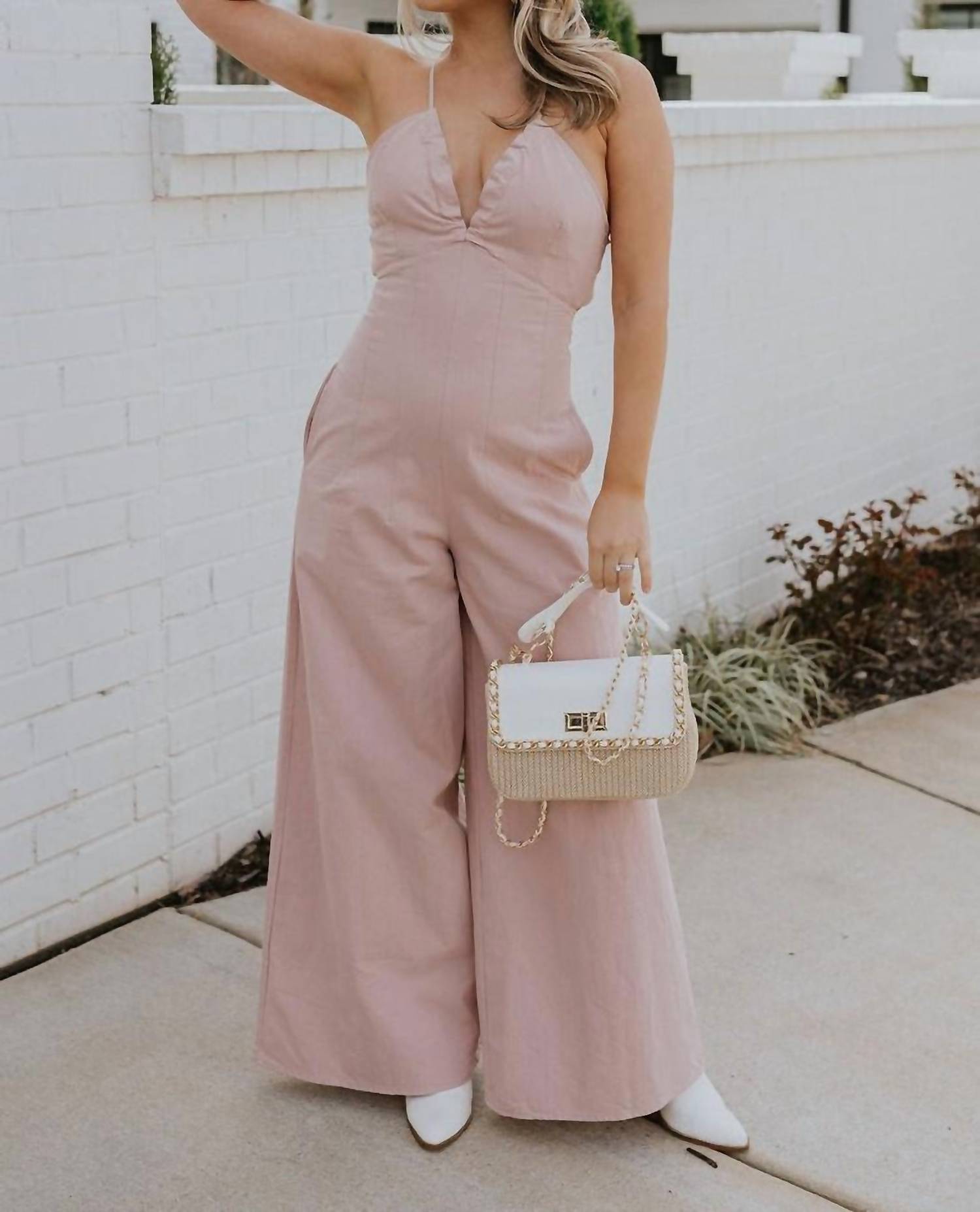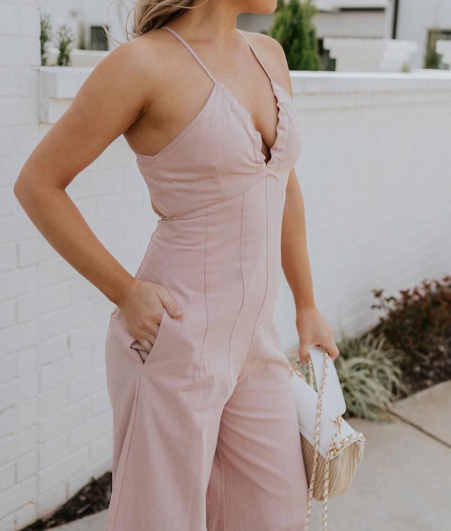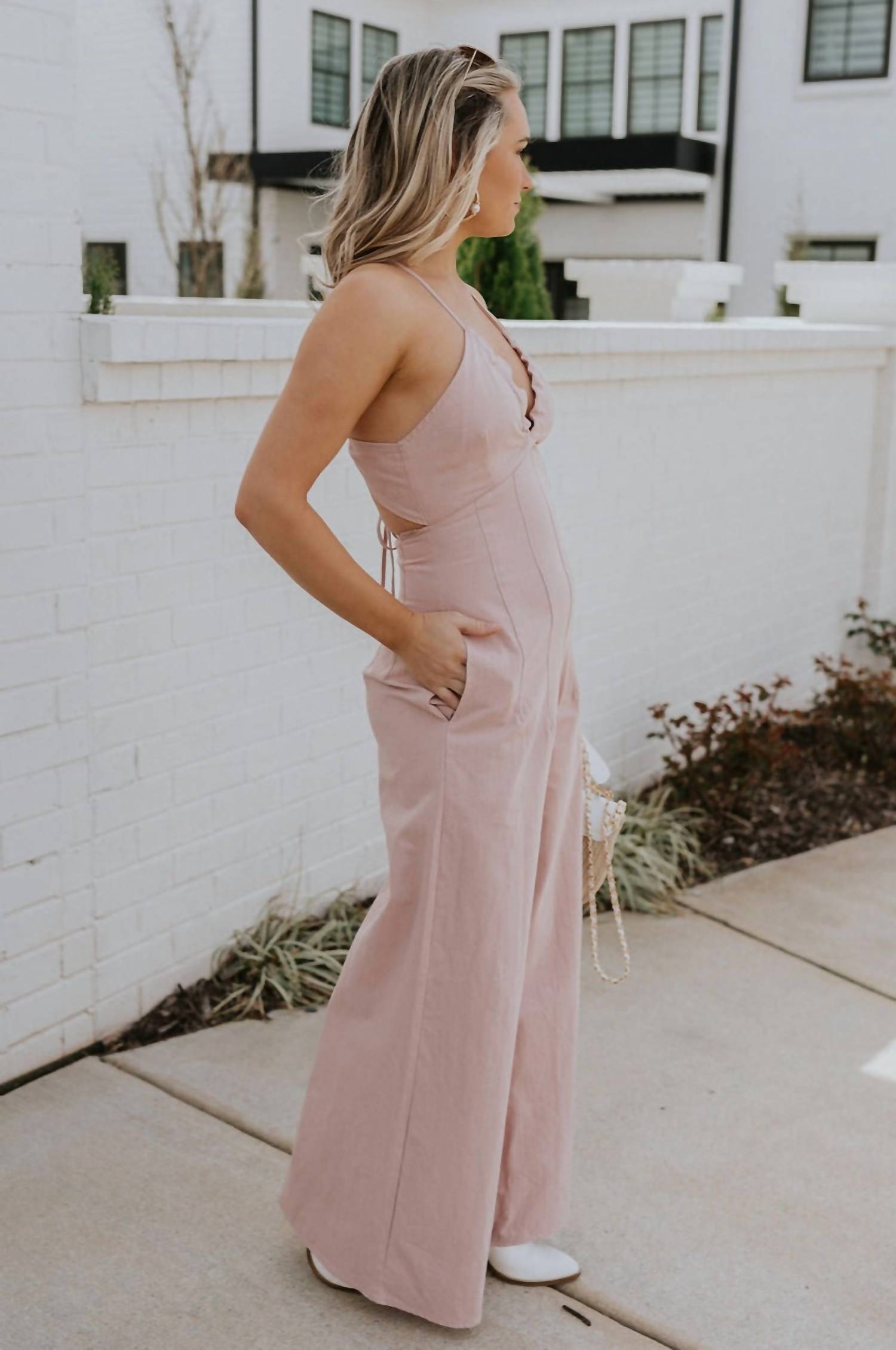 It doesn't take much for this one piece to look effortlessly cool. Add some statement jewelry to dress it up, or throw on some sneakers for a more casual vibe. Meet the Aleah Sleeveless Jumpsuit by C'isa, a chic piece crafted from a luxurious cotton blend in a captivating mauve pink hue. This jumpsuit features a flattering wide-leg silhouette with elegant upper ruched detailing, alongside practical side pockets for added style and functionality. Designed with a scooped neckline, adjustable straps, and an alluring open back with a tie and zipper closure, it offers customizable fit and effortless glam. Care instructions recommend hand washing this versatile ensemble, making it an ideal choice for any spring occasion, especially Thanksgiving dinner parties.