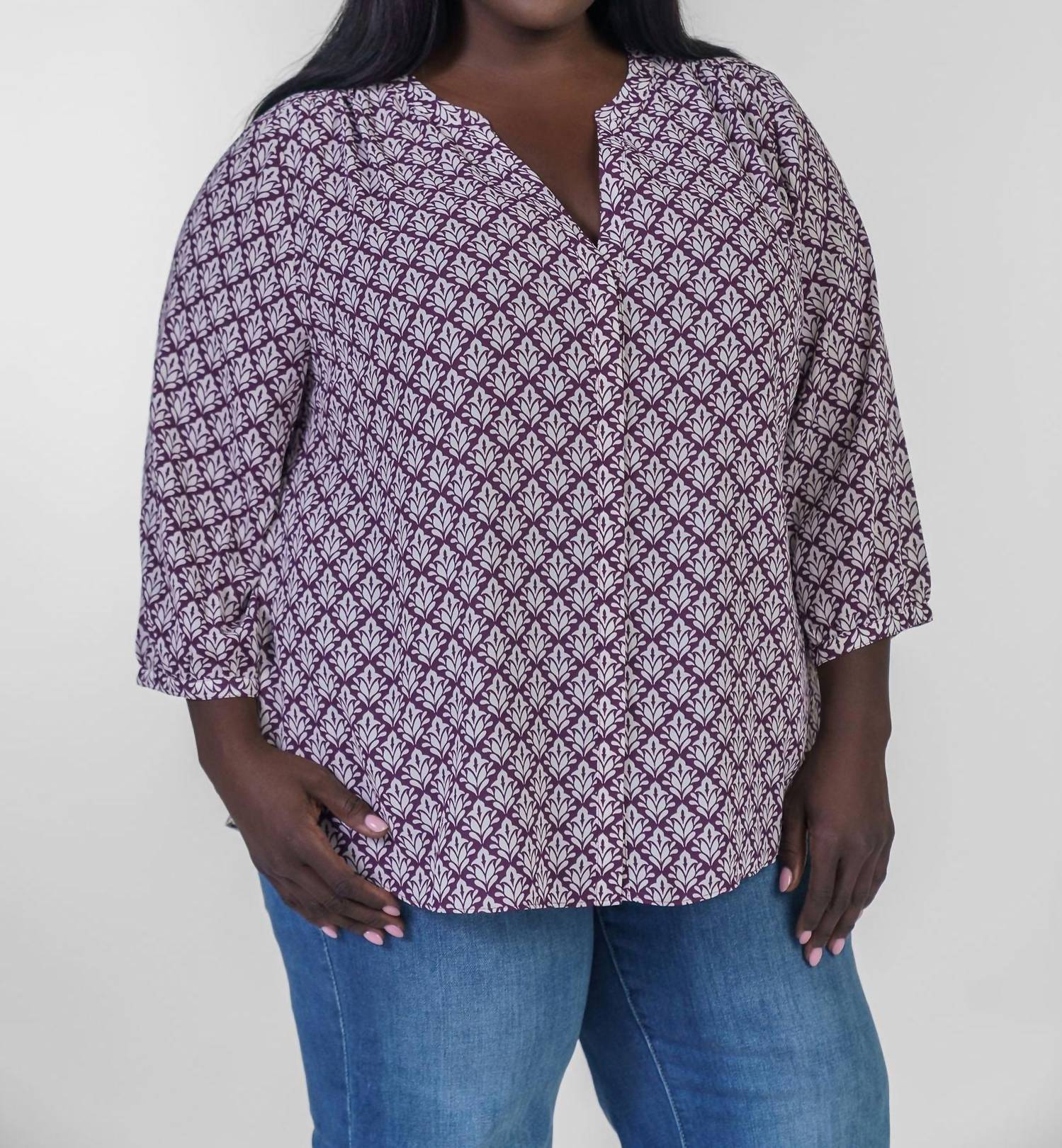 Pair this with your favorite jeans and slides for your next girls night out. Presenting the Pintuck Button Down Blouse by NYDJ in a fashionable Poplar Glen color, crafted especially for plus sizes. Featuring a three-quarter sleeve design, patterned material made from 100% Polyester, this blouse offers both style and eco-consciousness. The V-neck split round neckline is complemented by a covered full front placket with button closures. Easily maintain its elegance with machine wash and tumble dry care instructions, perfect for integrating into your spring workwear collection.
