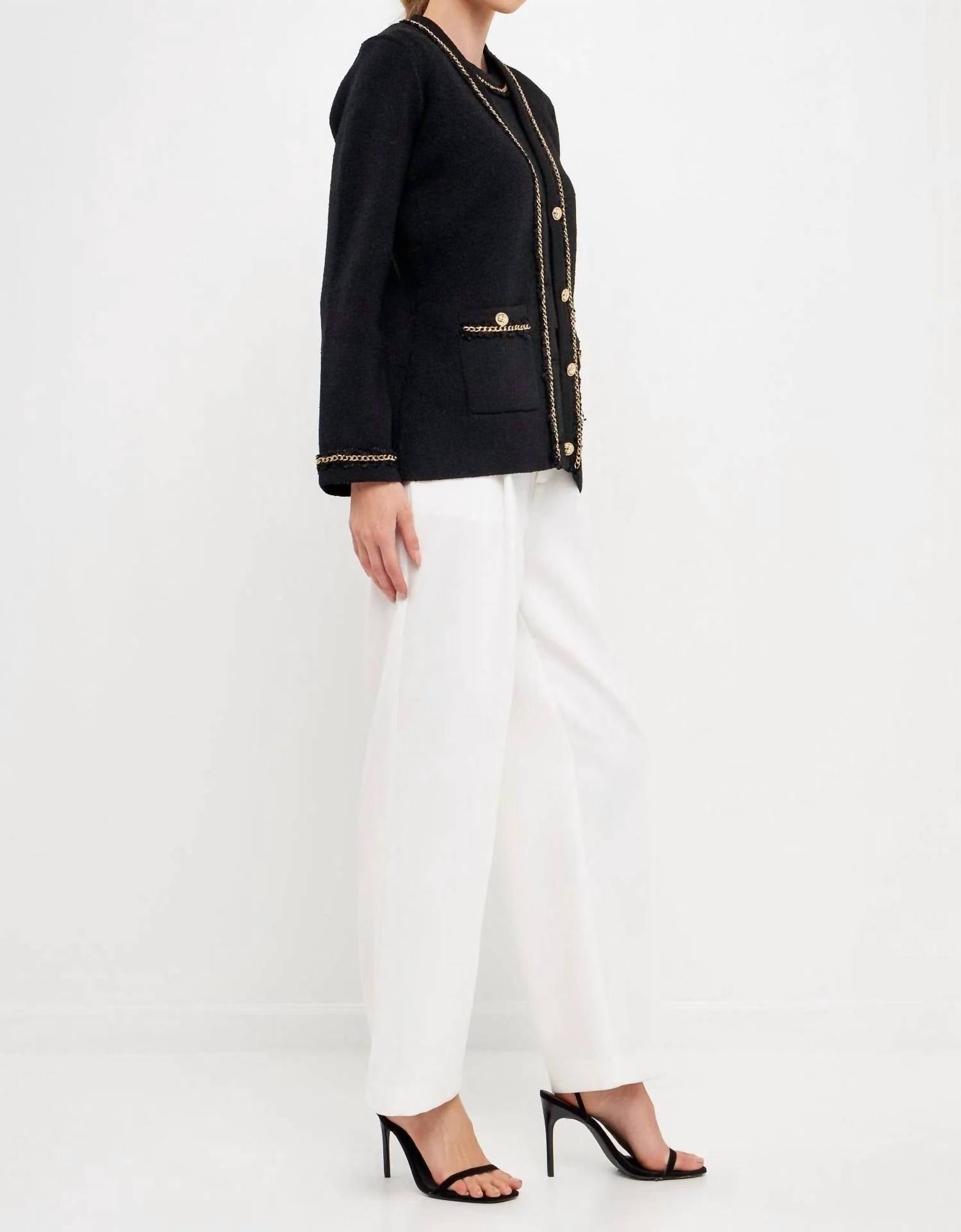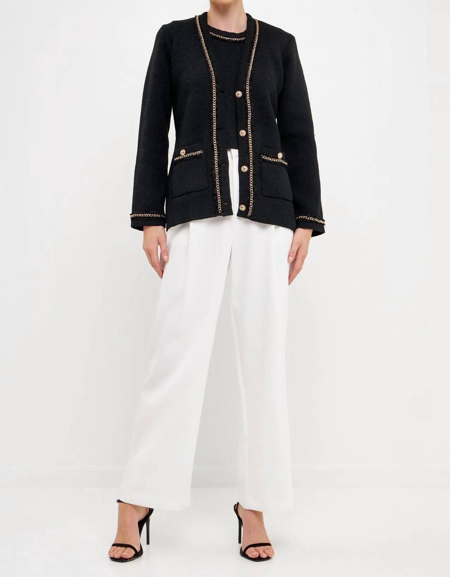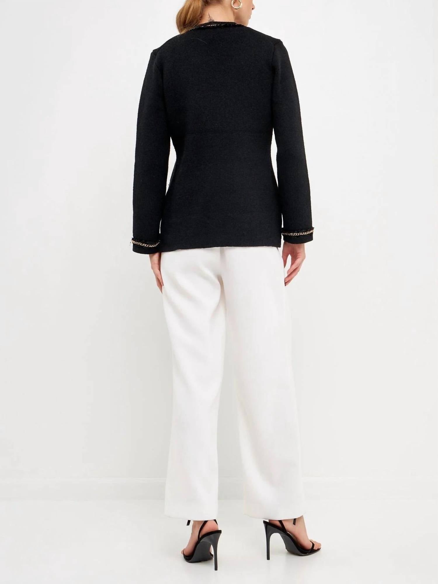 A classic fit that works just as good buttoned as it does left open. Introducing the Fifa Chain Trim Cardigan by endless rose, a stylish choice for any wardrobe in a timeless black hue. The cardigan features long sleeves and is crafted from a 67% Acrylic and 33% Nylon blend for softness and durability. With a length of 26 inches and a bust of 36 inches, it offers a flattering fit along with its button closure and sophisticated trim details. Designed with practicality in mind, it includes front pockets with button closures and a chic V-neckline.