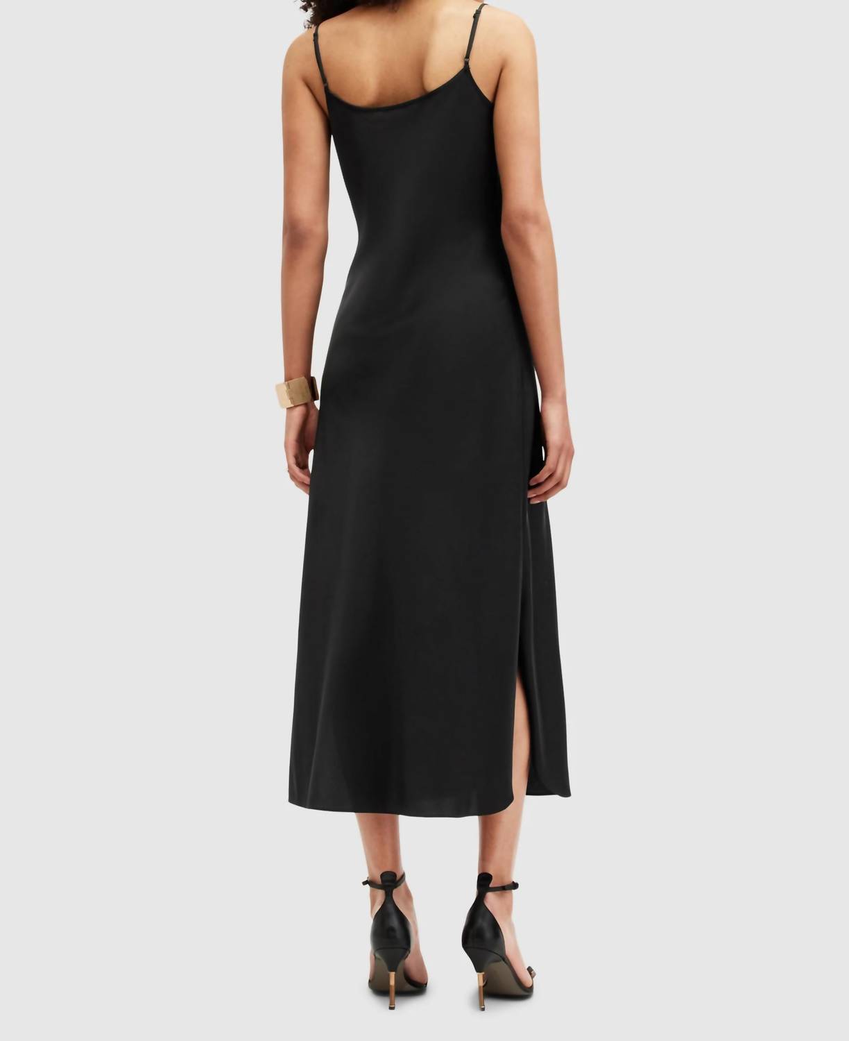 The perfect length dress does exist. Meet the Hadley Cowl Neck Midi Slip Dress by AllSaints, a perfect blend of elegance and versatility for any dinner party. This chic black dress comes with spaghetti straps and a sophisticated cowl neckline, crafted from a smooth synthetic fabric that feels luxurious against the skin. The main fabric is a blend of 96% polyester and 4% elastane, with a lining of 100% polyester. Made in China and featuring a side zipper closure, this sheath silhouette is easy to maintain with machine wash care. Embrace a minimalist trend with its sleek solid pattern, designed to highlight your figure with grace.
