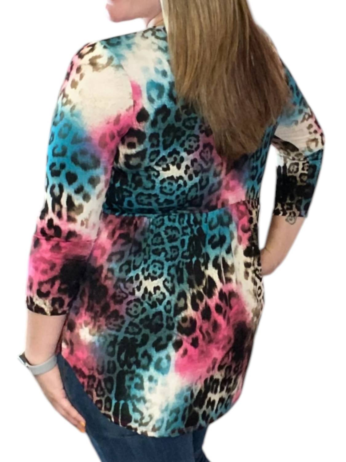 Groovy predator print design. V-neck with long sleeves. Soft, comfortable, and perfect fit. Made from 94% Polyester, 4% Spandex blend.