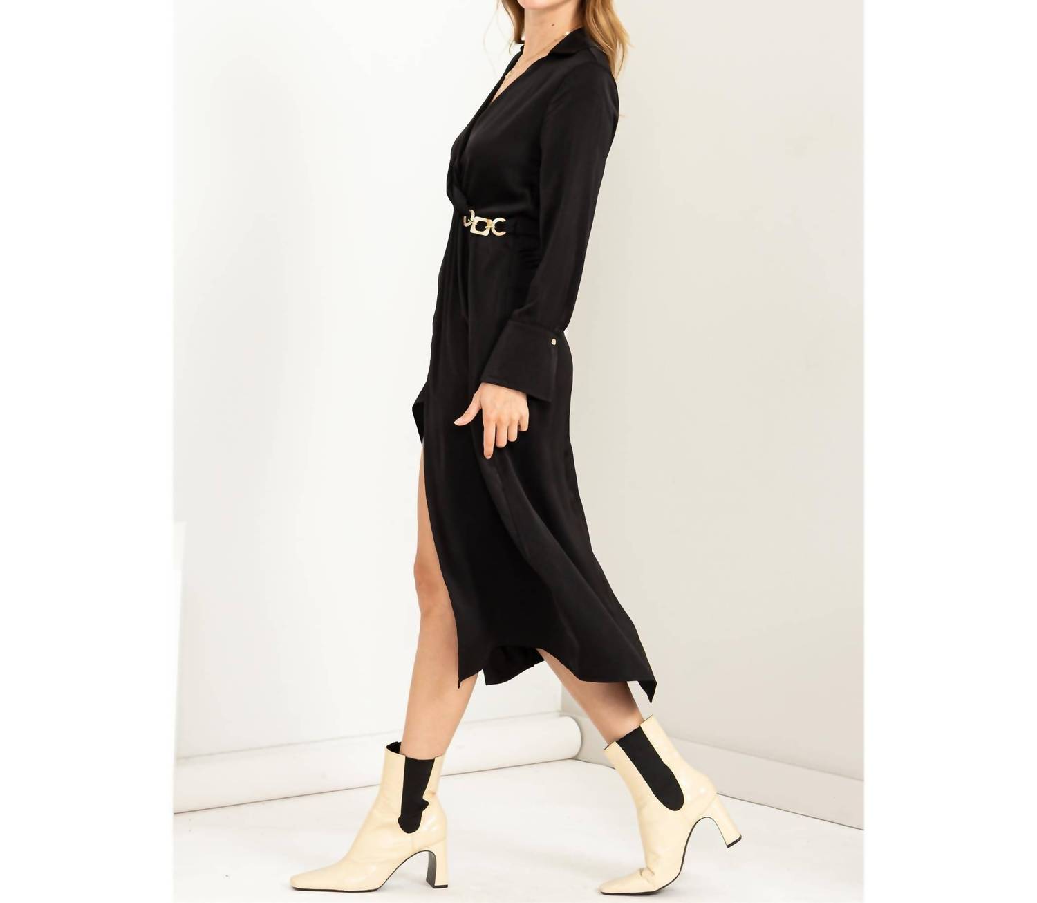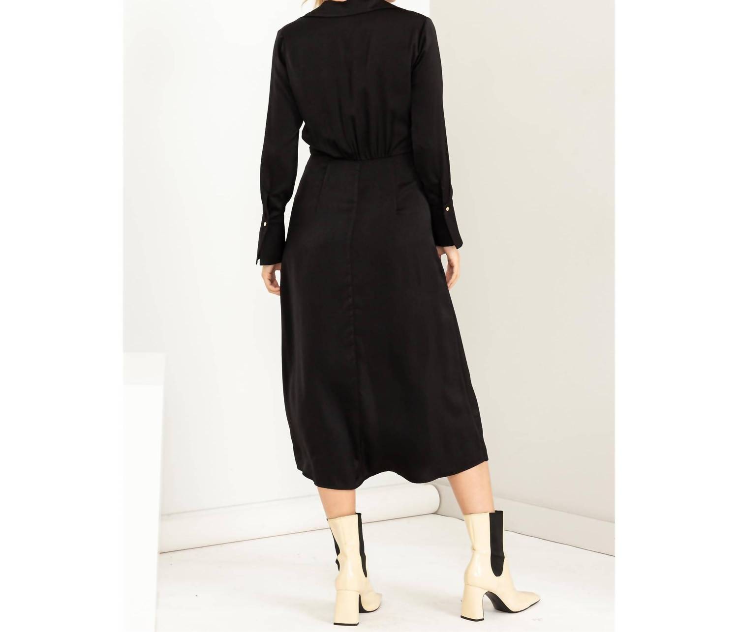 Cute and comfortable, this long sleeve dress has it all. Embrace sophistication with the Kind Hearted Satin Wrap Effect Midi Dress by HYFVE, designed in a sleek black solid pattern. This women's wrap dress features a surplice bodice with a collared V-neckline and long sleeves, creating an elegant silhouette. Made from 100% polyester, it highlights gleaming gold-toned hardware at the high waist and a front center opening in the draped wrap skirt. Perfect for evening events, this dress includes a tie closure and is imported, showcasing minimalist style for the spring season. Model is 5'9" with a 34C chest, 24" waist, and 35" hips, wearing a size small.