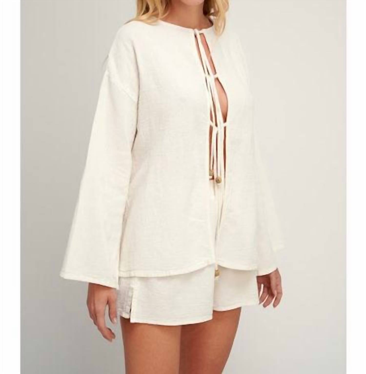 A versatile blouse that works from desk to dinner! Introducing the Iralika Tie Front Top by Pearl and Caviar, a minimalist piece in solid off-white designed for a relaxed fit. With long sleeves and crafted from 100% cotton, this blouse offers a lightweight, non-stretchy fabric perfect for various occasions. It features a boatneck design and adjustable tie closure at the front, ideal for both casual and elevated looks. Care instructions: Machine wash. Model is 176cm/ 5'9" and wears a size S/M.