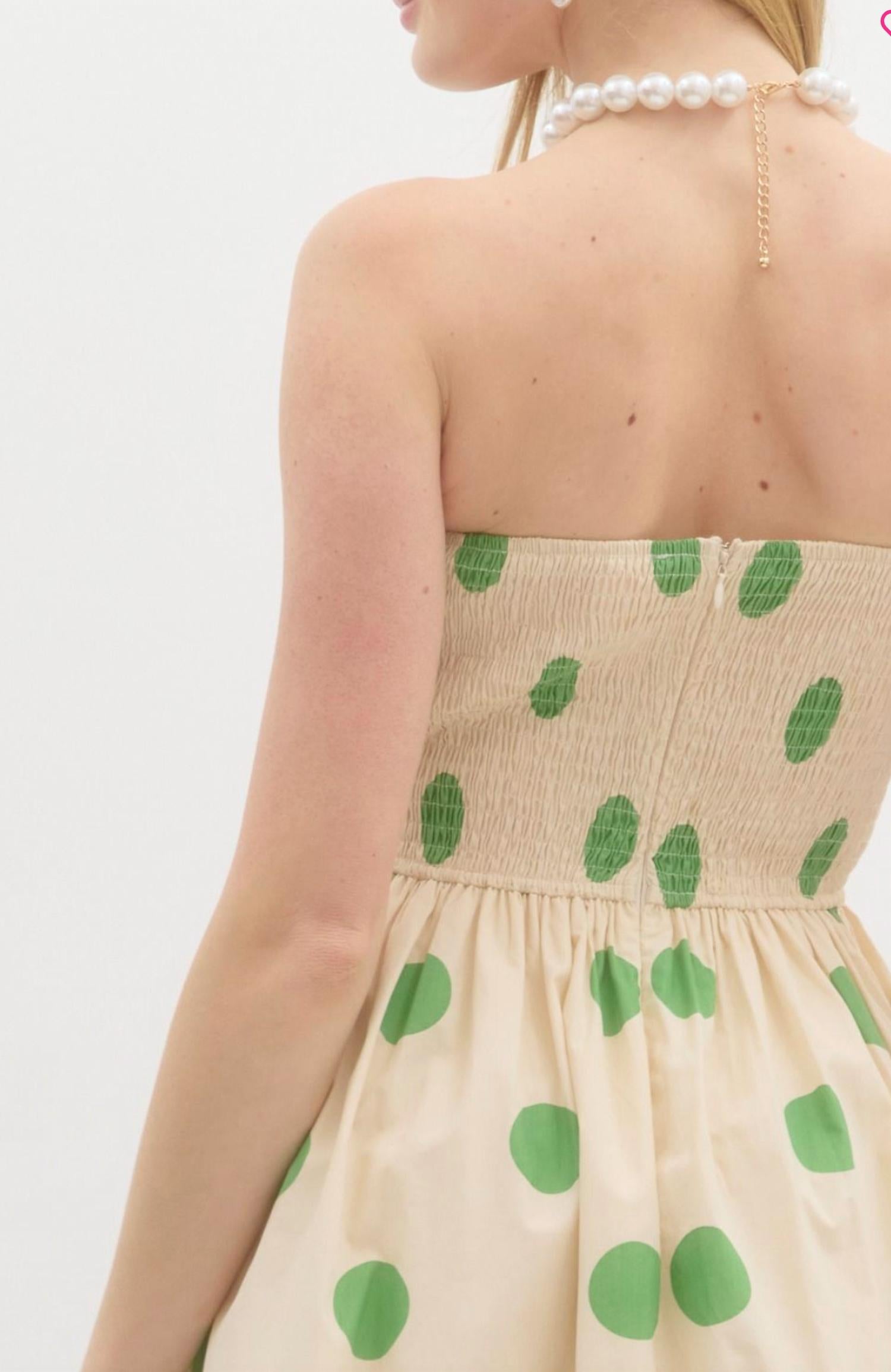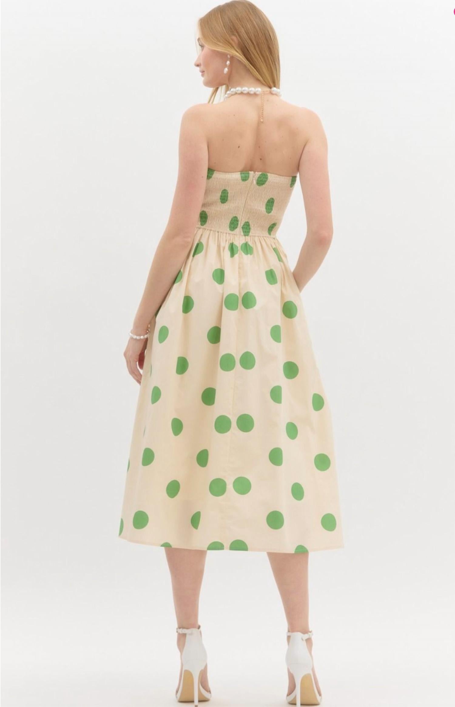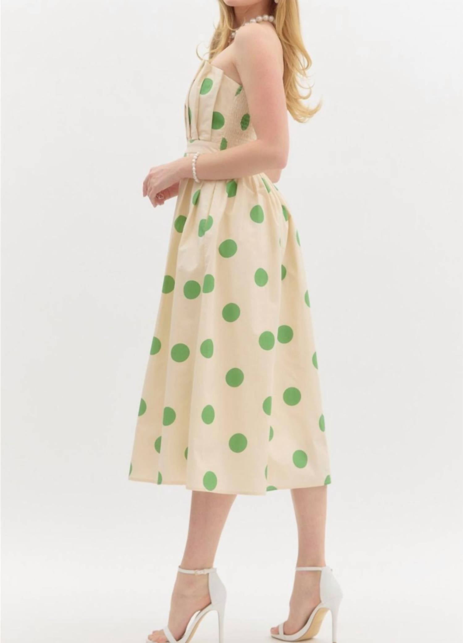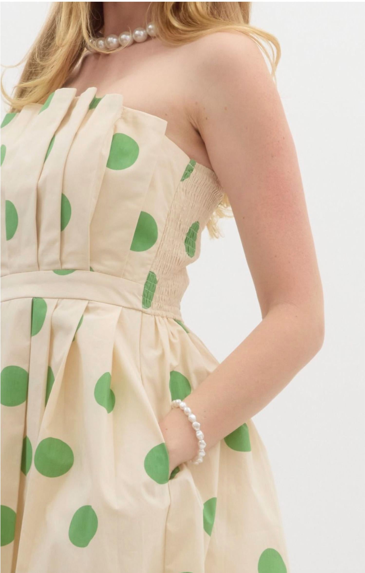 The perfect length dress does exist. Unleash your boho chic style with the Polka Dot Strapless Midi Dress by Entro, now in a playful yellow. This strapless, fit-and-flare silhouette features a flattering pleated skirt and elasticated smocked panel for a comfortable fit. Made from 100% cotton, it offers the convenience of pockets and a zip closure for easy wear. Care instructions include machine wash only. Model is 5'10" and is wearing a size small.
