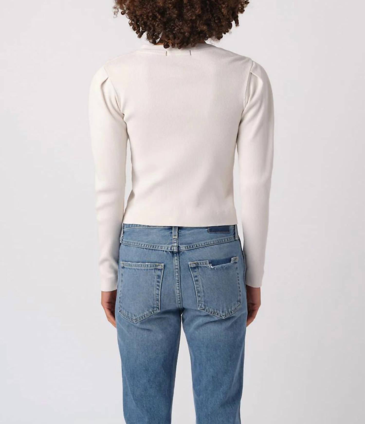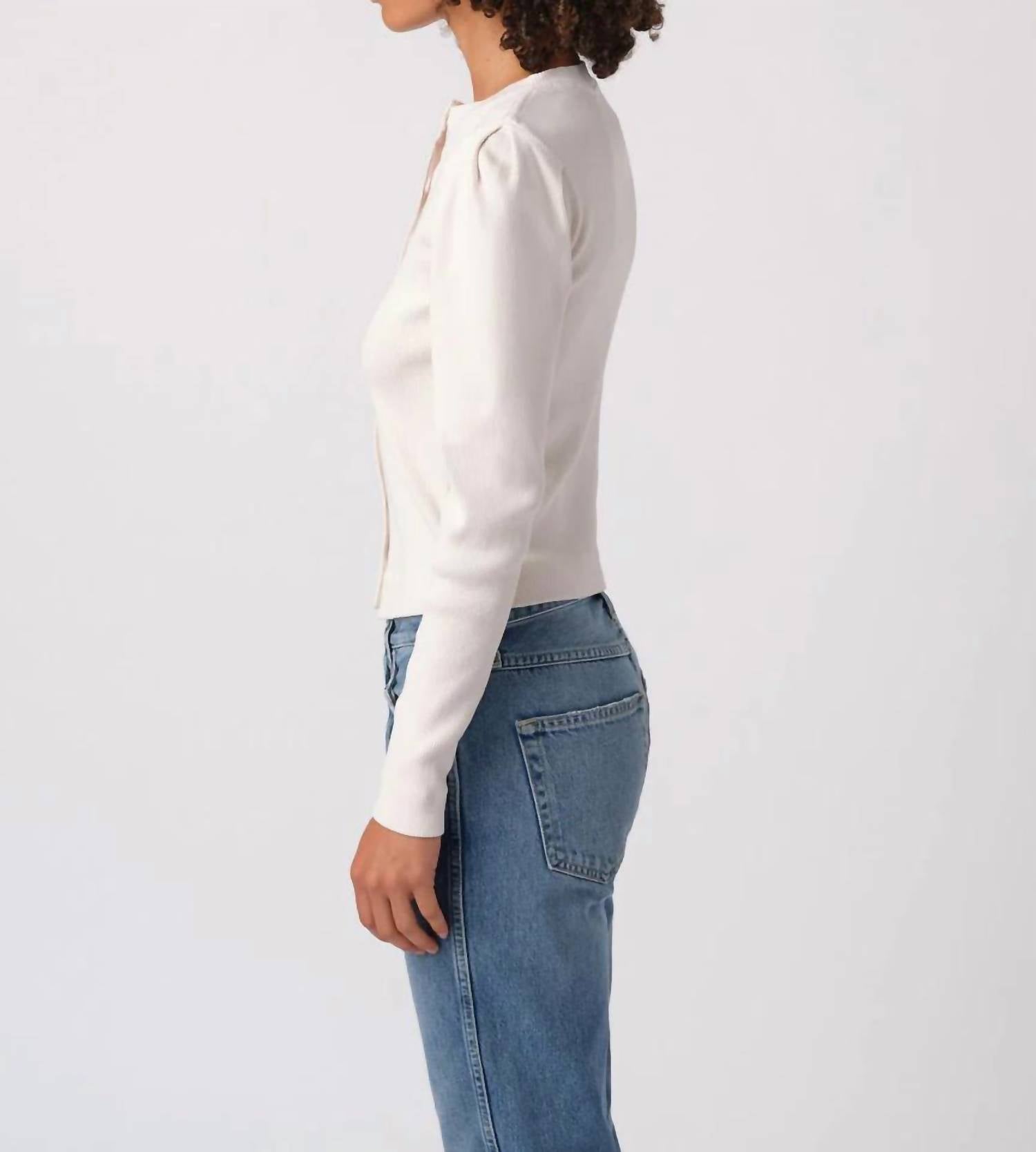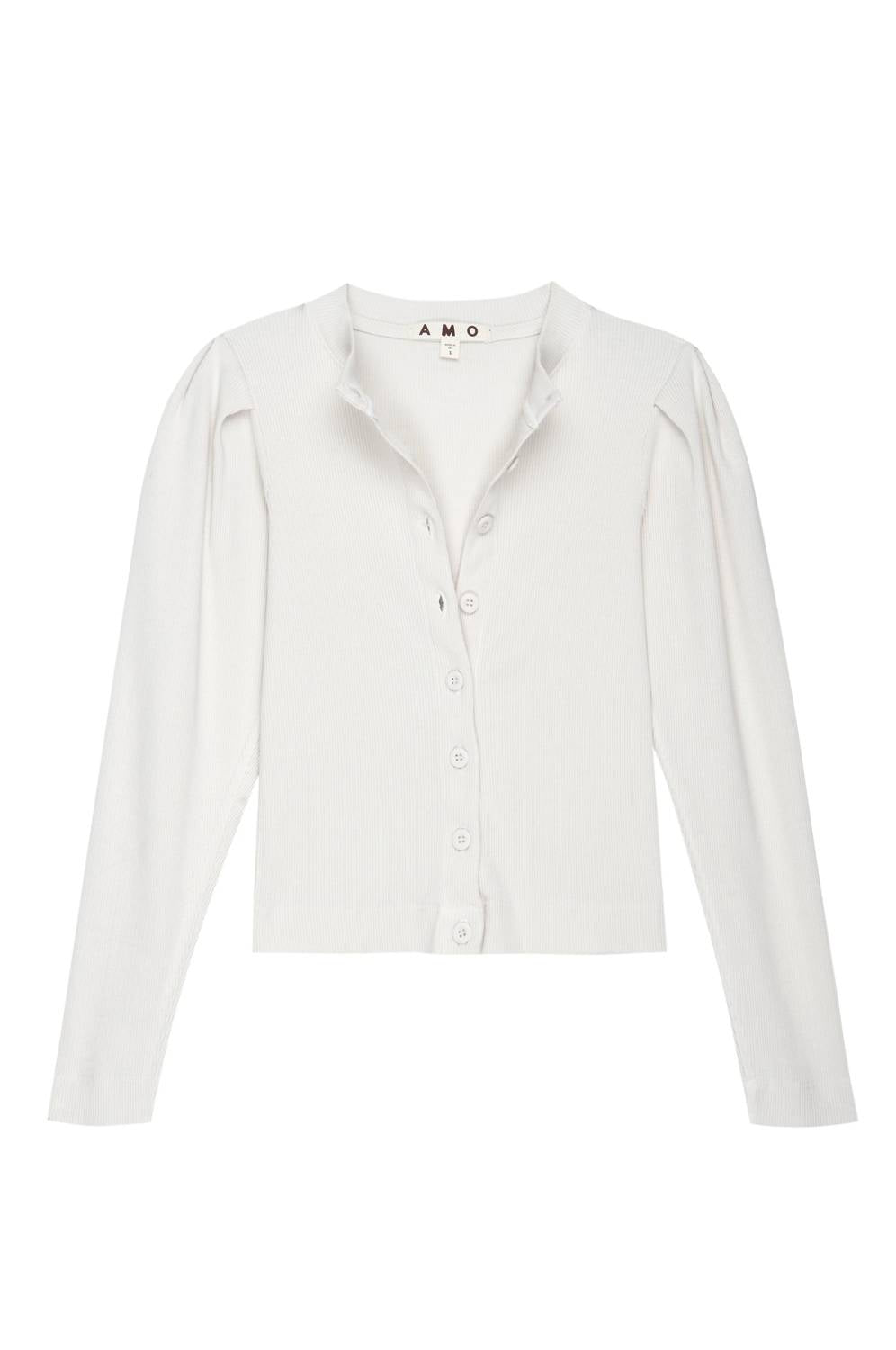 Throw this adorable cardigan over any cami or tank top. Introducing the AMO Puff Sleeve Cardigan in elegant Off White, a fashionable addition to any wardrobe. This piece features long sleeves with bold, "puffed" shoulder design, crafted from a custom ribbed mid-weight 100% cotton for ultimate comfort and style. Slightly cropped with a total length of 19 1/4" from the shoulder, it fits true to size and is made with love in Los Angeles. With a classic crewneck and secure button closure, it's a versatile choice for both standalone wear or layering and is perfect for engagement occasions. Effortless care with machine wash cold instructions.