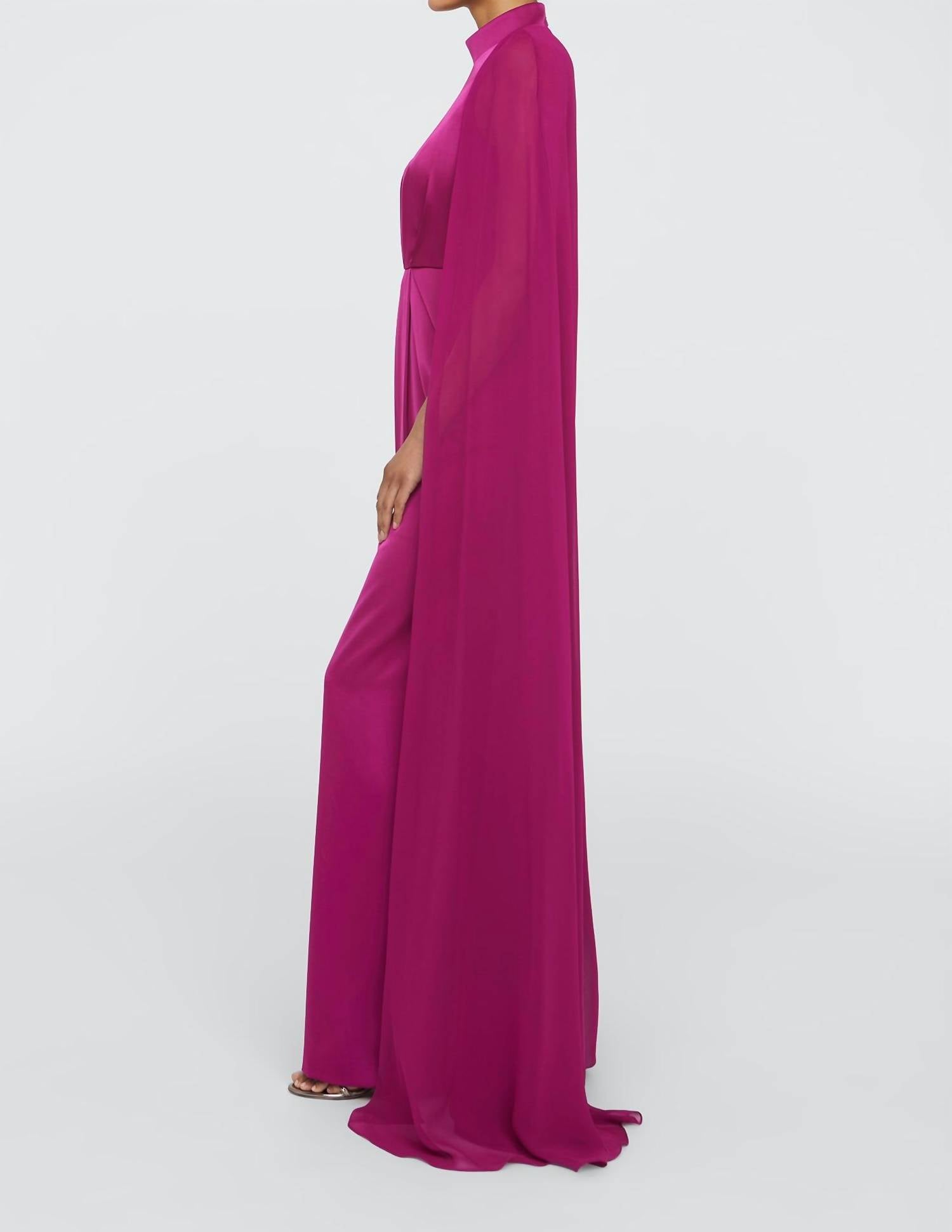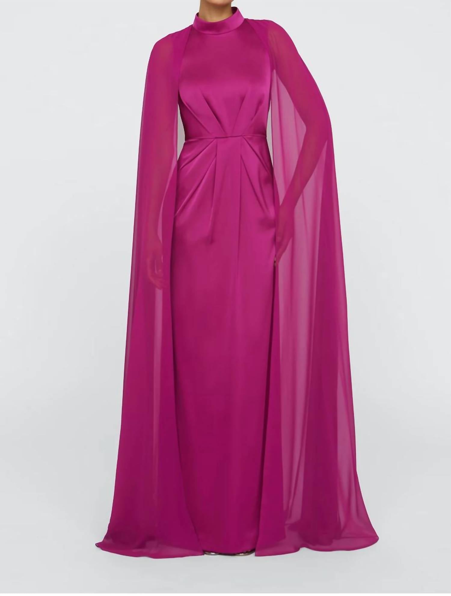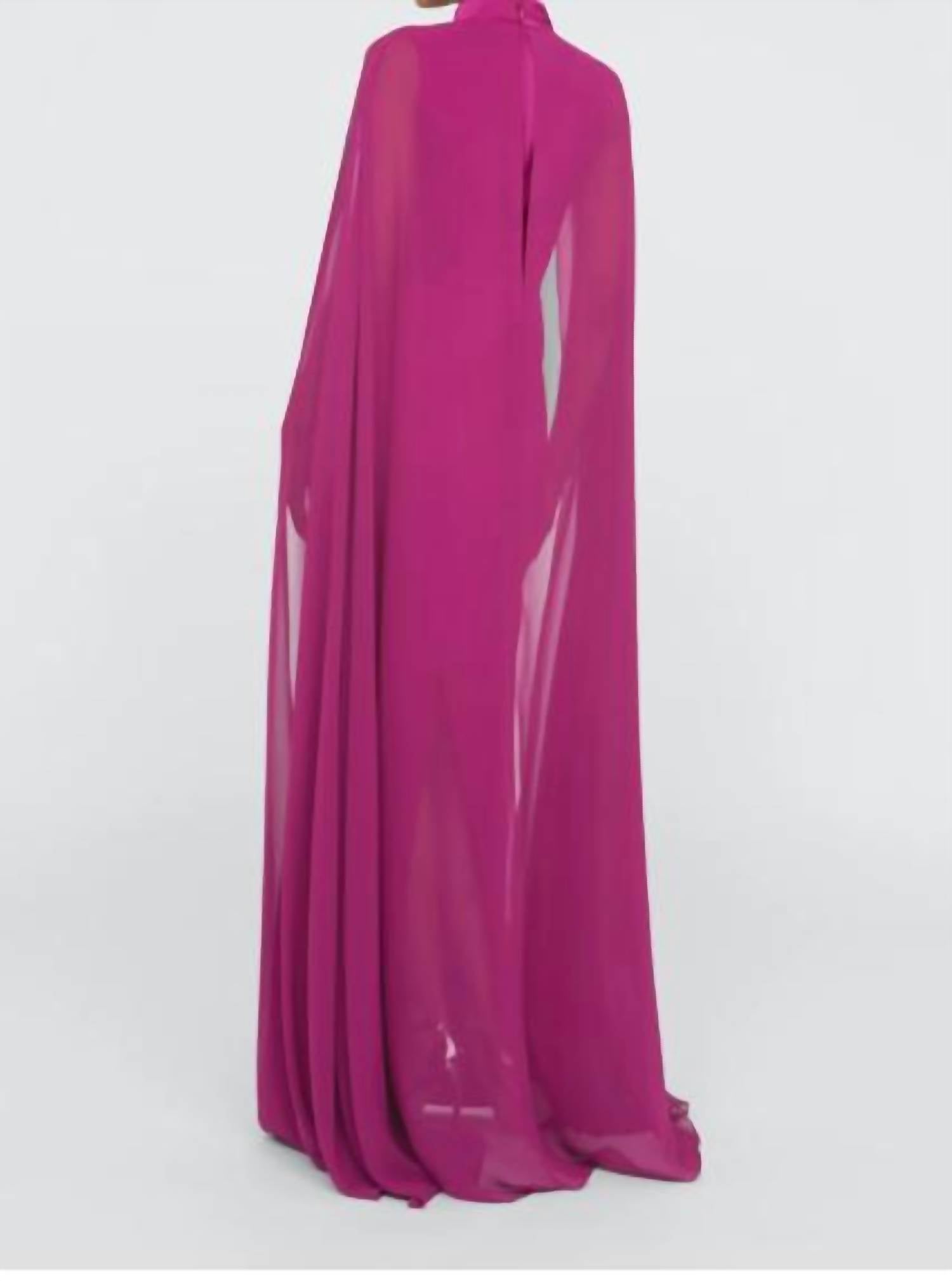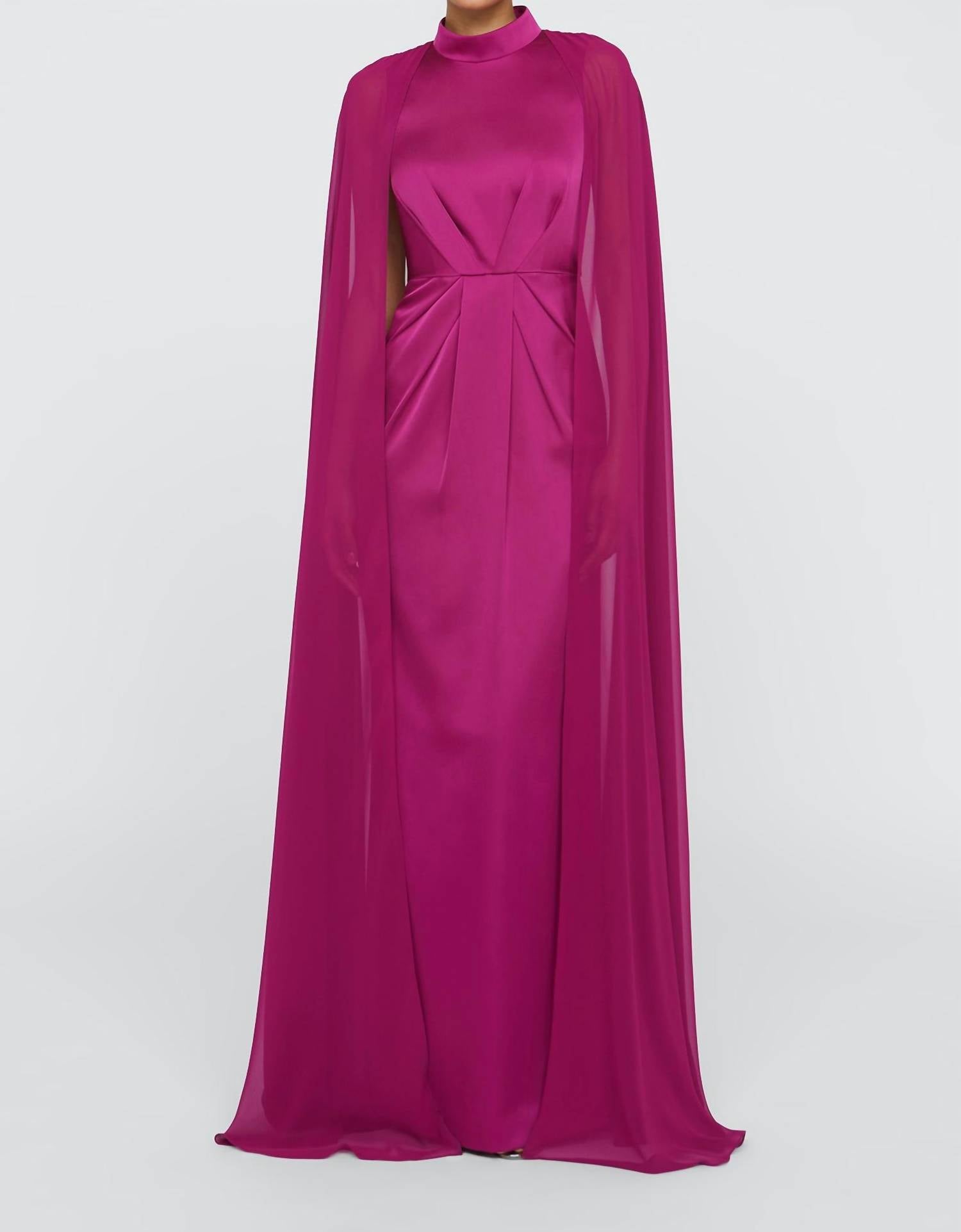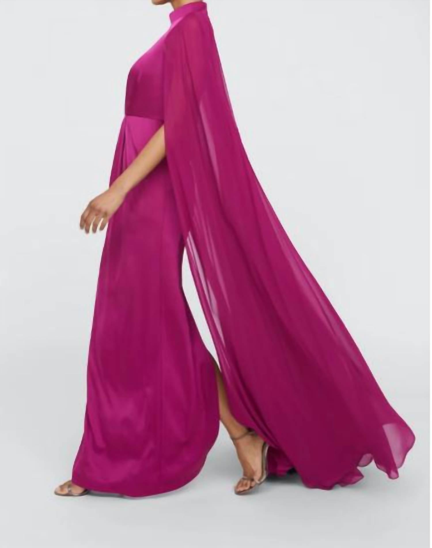 Who doesn't love a good maxi dress? This one you'll be reaching for season after season. Step into elegance with the THEIA Phillipa Cape Gown, a stunning choice in Sangria. Crafted from textured polyester, this floor-length gown features a cap sleeve cape and a mock neck, creating a fit-and-flare silhouette that's perfect for any evening event. The sheer chiffon cape adds a touch of drama, making it ideal for galas and red carpet occasions. Care: Dry clean only.