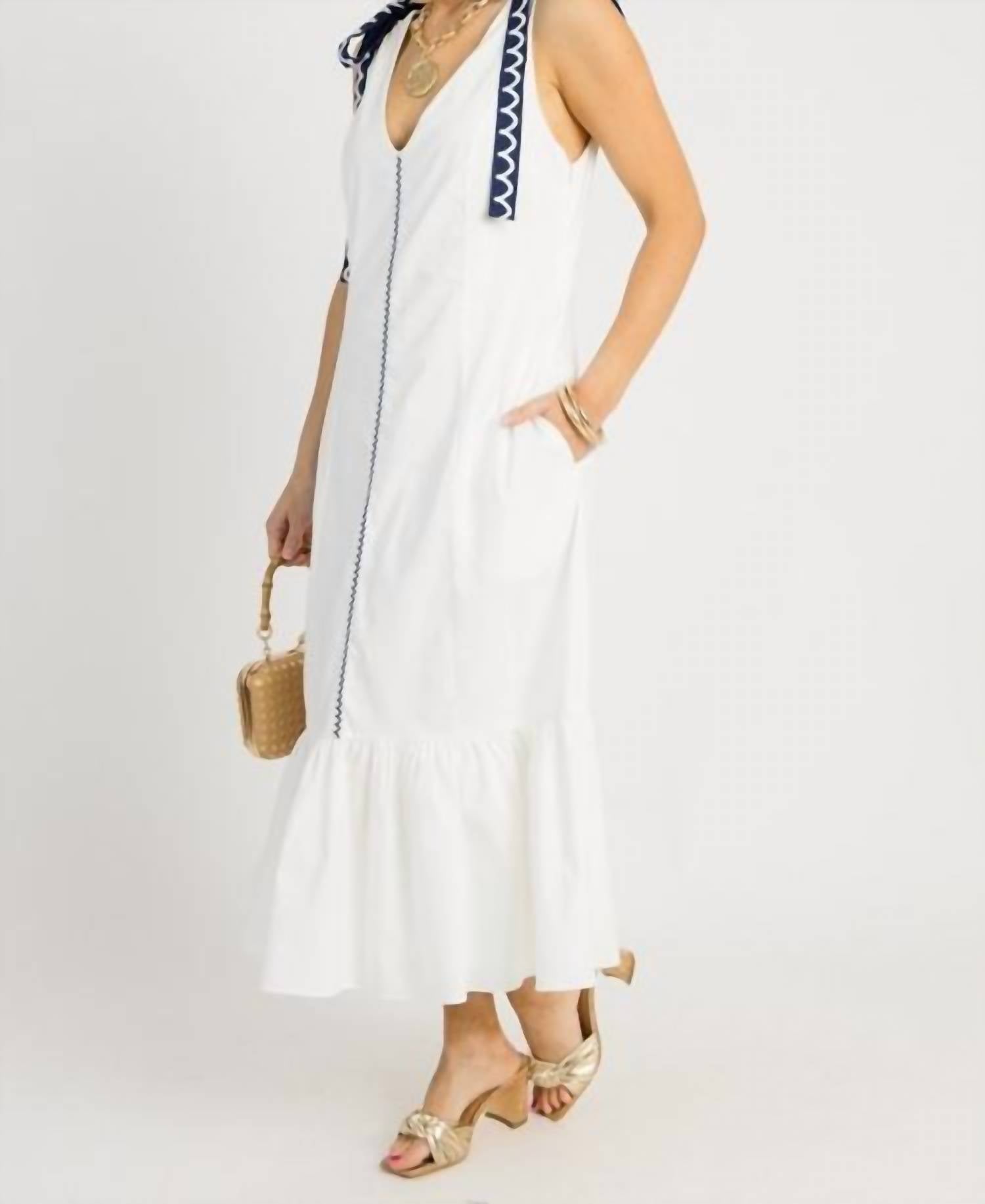 A midi dress so versatile, your options for wearing it are endless. Discover the Hillary Midi Dress by Strut & Bolt, a delightful off-white piece that embodies Boho Chic style. This sleeveless dress is expertly tailored from a blend of 67% Polyester, 30% Cotton, and 3% Spandex, making it light and comfortable for summer wear. It features playful scallop embroidery and navy embroidered bow ties, enhancing its A-line silhouette with a V-neckline and practical side pockets. The dress is finished with an invisible zipper closure for a seamless fit, perfect for sunny days or casual dinner parties.