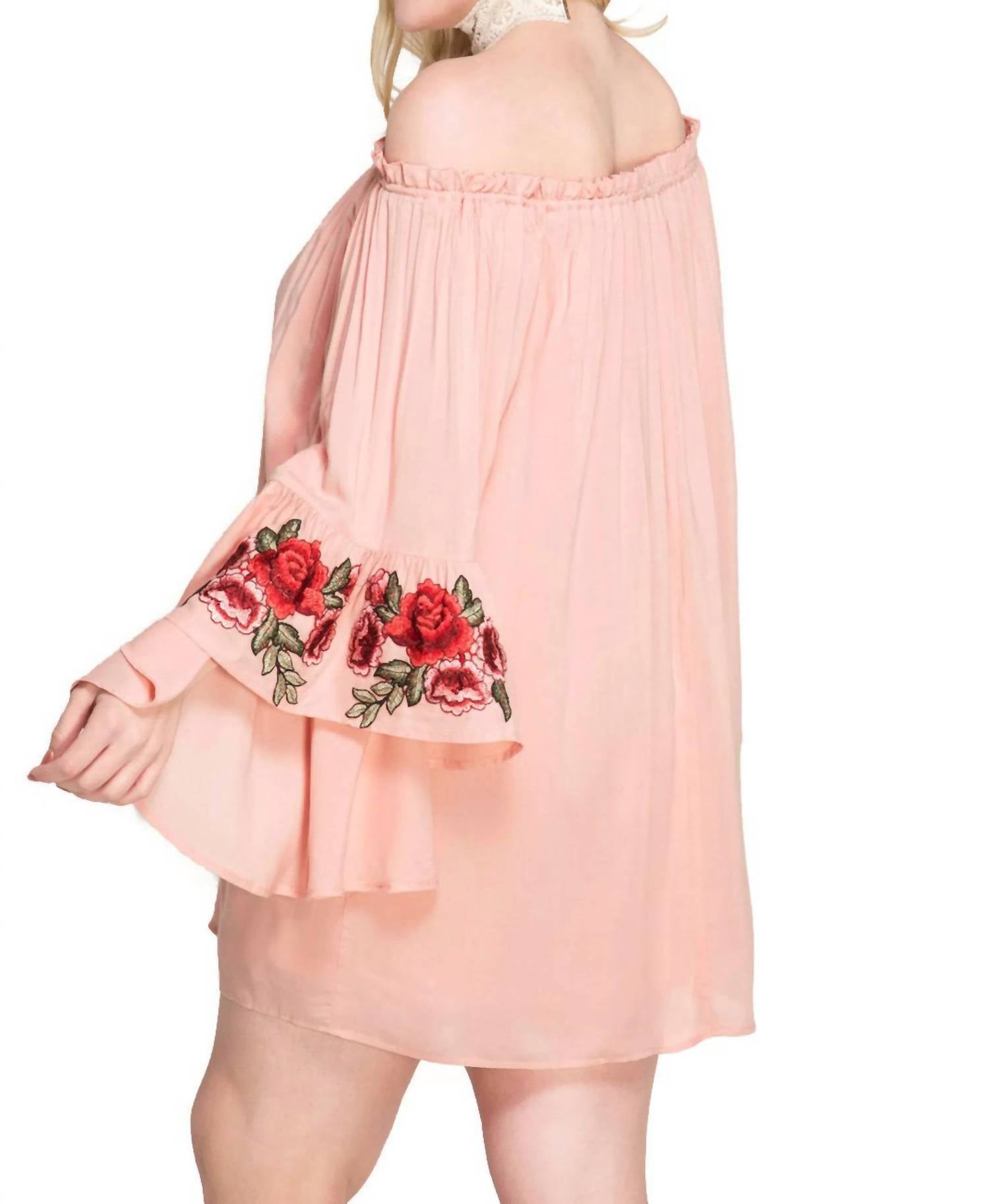This boho babe features an off-the-shoulder neckline, 3/4 bell sleeves, floral patch embroidery on the sleeves, is fully lined, and has a mini A-line relaxed fit. XL Bust 40"; Length 32"; 1X Bust 42"; Length 32.5"; 2X Bust 44"; Length 33". 70% Cotton, 30% Polyester; Lining 100% Polyester; Hand wash cold; Imported.