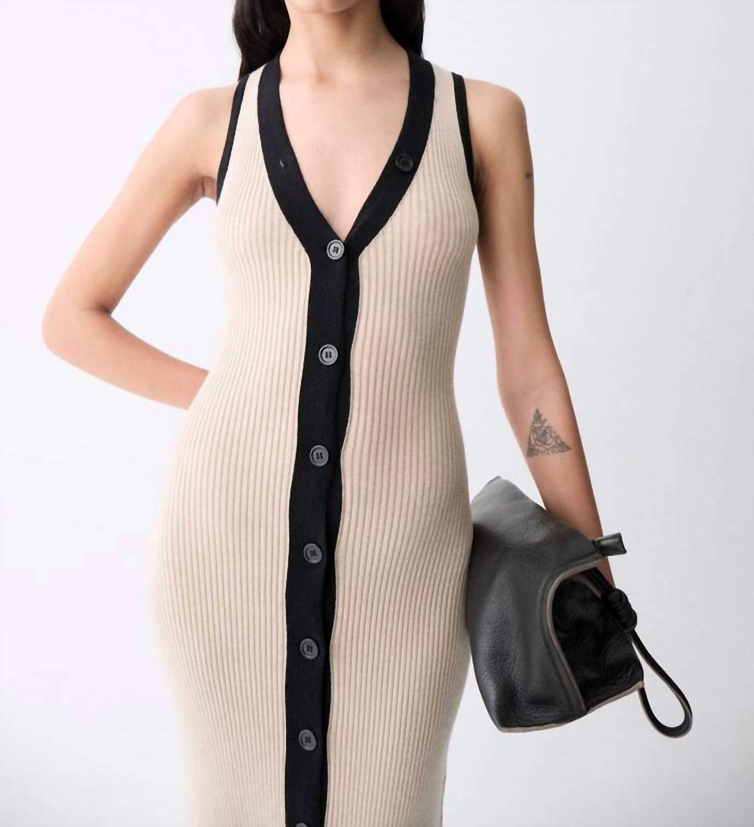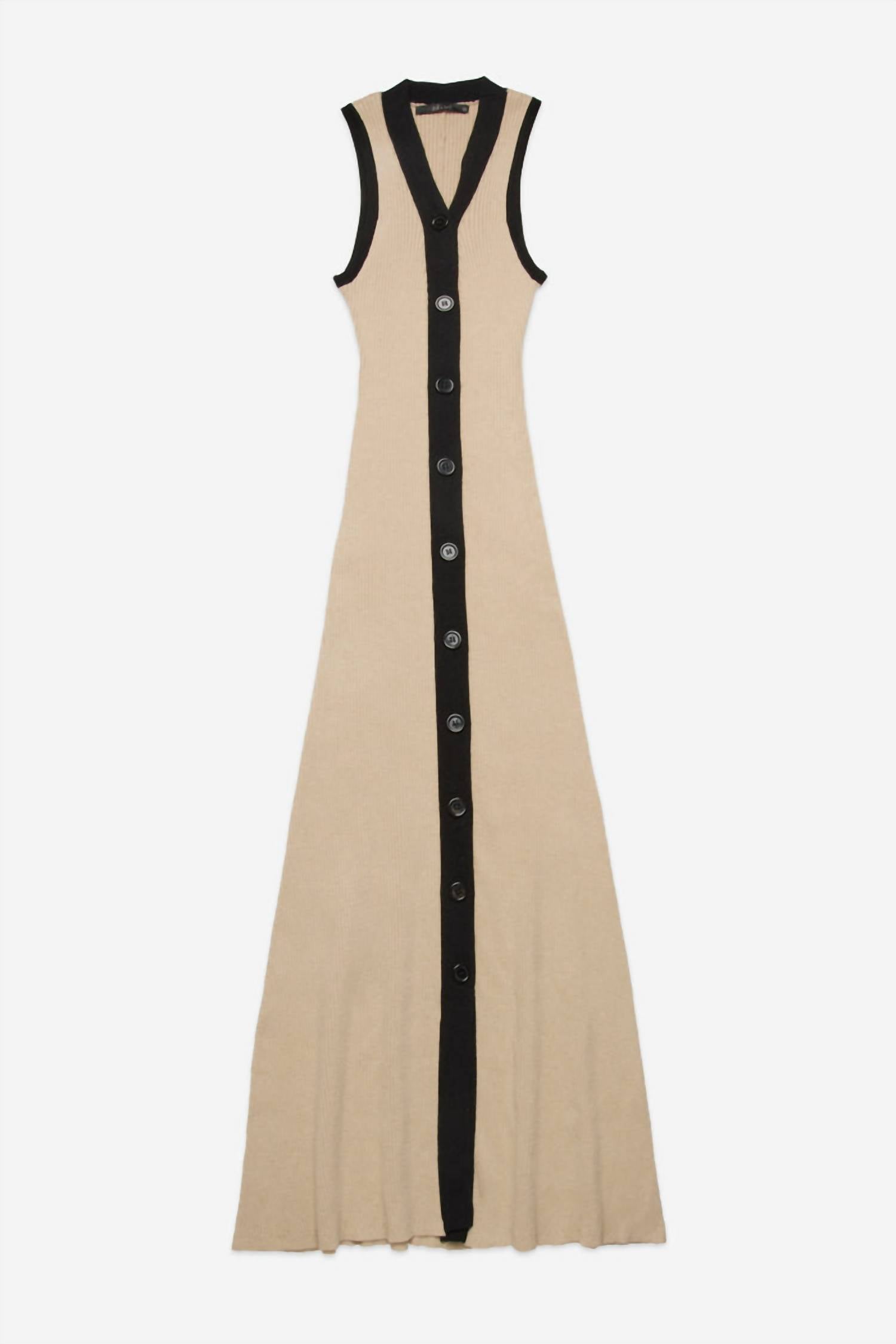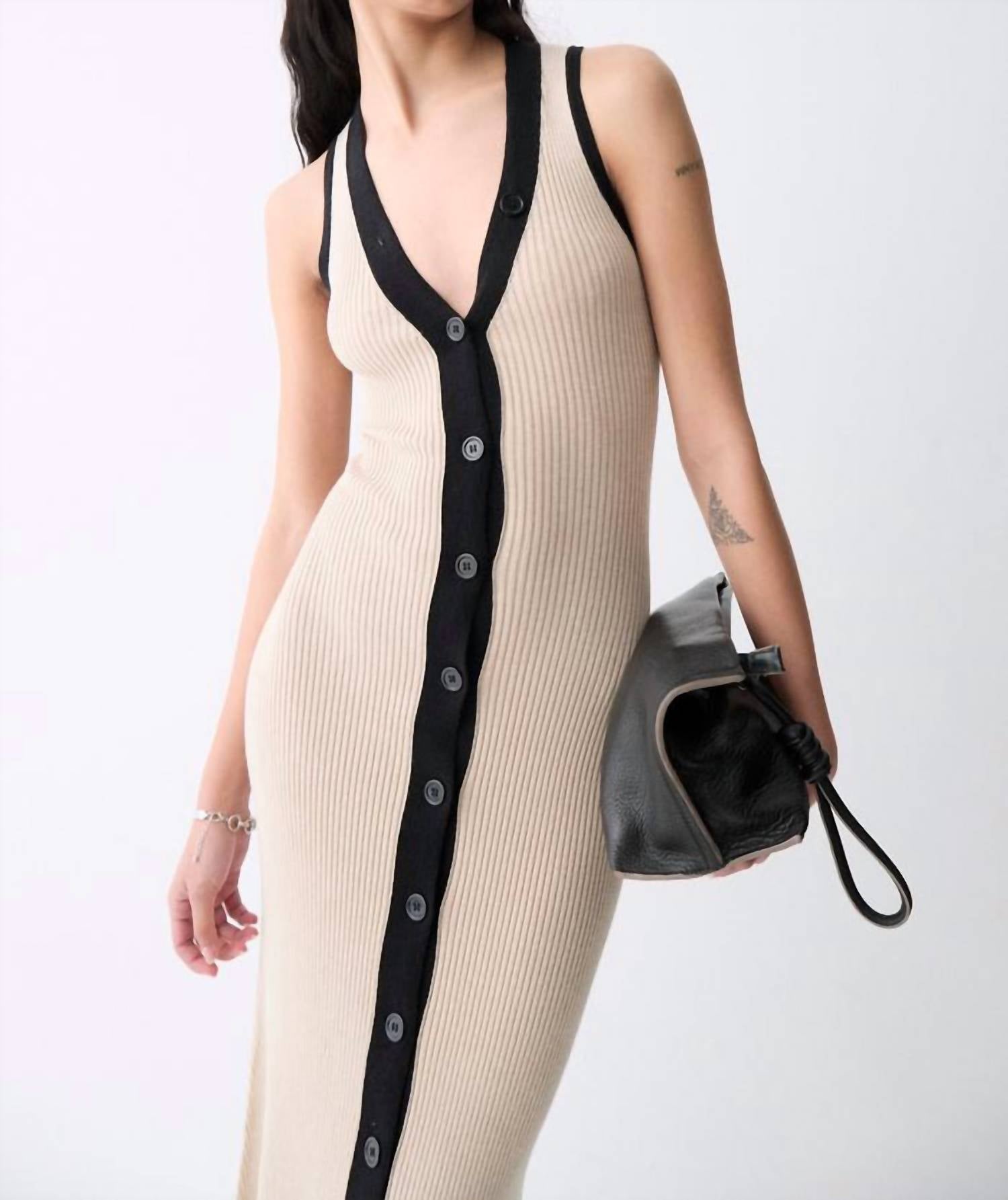 A maxi dress that is just as cute as it is comfortable. The Vila Knit Dress by DELUC is a stunning piece crafted from a 60.8% viscose and 39.2% polyamide blend. This sleeveless maxi dress features a flattering V-neckline and contrast cuffs, offering a chic textured pattern in an ecru and black color scheme. It is designed with a fitted silhouette and a front button closure for effortless sophistication. Ideal for women seeking a timeless style, this dress fits true to size and pairs perfectly with understated accessories.