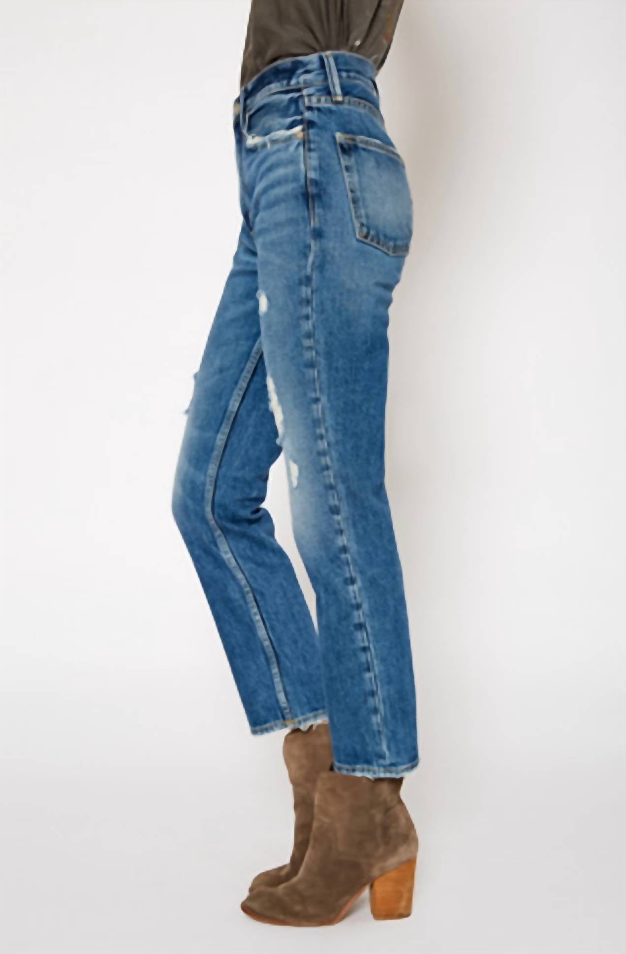 Introducing the Claude High-rise Straight Jeans by NOEND, designed for women seeking both style and comfort. These solid blue jeans feature a comfortable high-rise, 10.75-inch waistband, and a 27-inch inseam for a flattering fit. Crafted from 100% cotton, these jeans are made in the USA and include practical pockets and a button closure. Care is simple with a machine wash, ensuring these jeans maintain their timeless appeal wear after wear.
