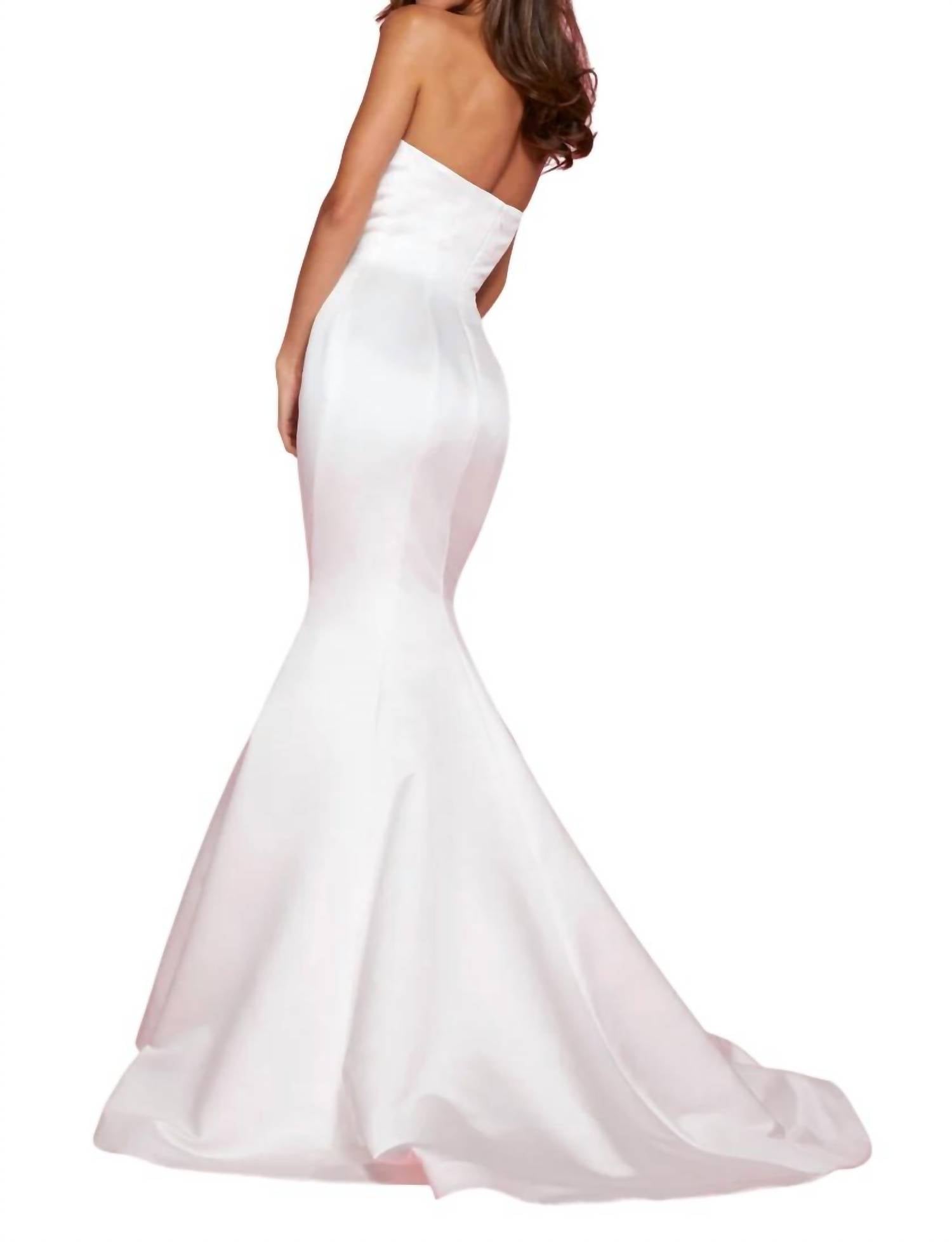 This women's sheath dress in elegant ivory features a strapless design that perfectly complements its sophisticated silhouette. Closure type is a secure zip, ensuring a flawless fit for your enchanting evening. SKU:53321