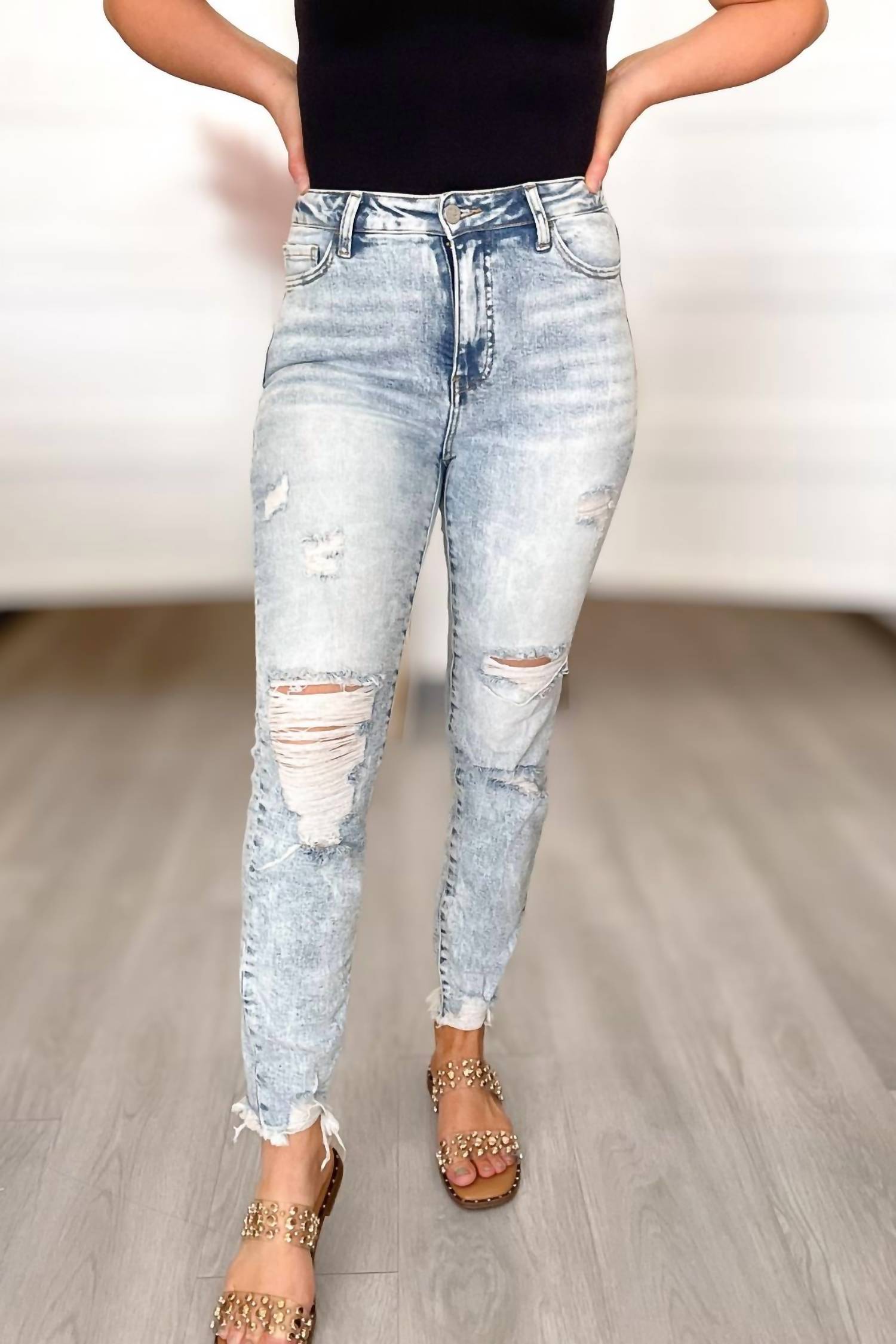 Everyone needs a good pair of skinny jeans and this is a style you'll keep reaching for no matter the season. These Billie Distressed Skinny Jeans by Blakely are designed in a stylish light wash with a fray hem, offering a chic look with just the right amount of distressing. Crafted from a comfortable blend of 95% Cotton, 3.5% Polyester, and 1.5% Spandex, they promise a snug fit with some stretch. Featuring a mid-rise design, these jeans have a zip closure and an inseam of 26.5 inches. With a skinny leg style and pockets for utility, they are perfect for everyday wear.