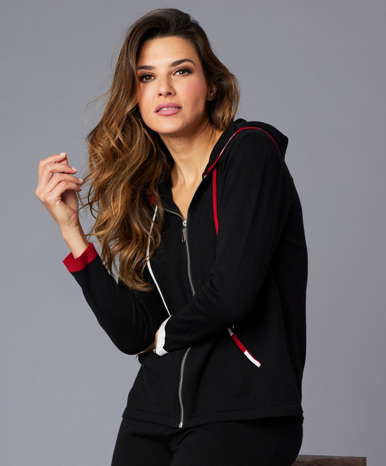 Zip up. Stripe detail. Long sleeve. Hits at hip. Cotton/Acrylic blend. Delicate hand wash or dry clean. Imported.