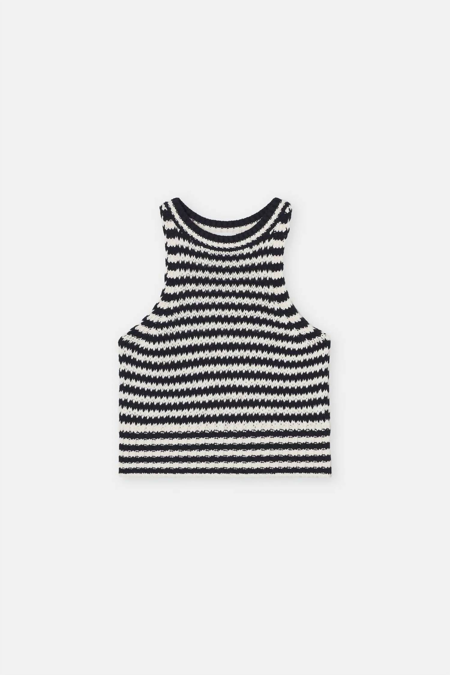This classic tank top is perfect for layering and cute enough to wear on its own. Introducing the Stripe Tank Top by CLOSED, a chic sleeveless piece in a striking black and white jagged stripe design. Crafted from chunky knit Italian yarn, this top boasts a composition of pure organic cotton, giving it a dry, textured feel. Made for preppy fall occasions like Thanksgiving and homecoming, its ribbed trims enhance the halter neckline and straight hemline for a refined finish. This easy-to-wear piece features a pull-on closure, offering a comfortable and stylish fit without the fuss.