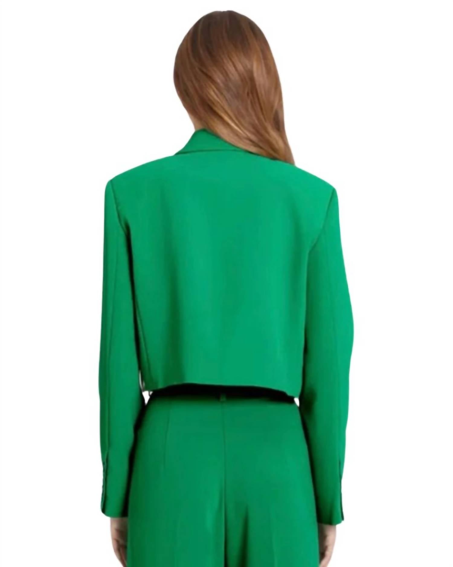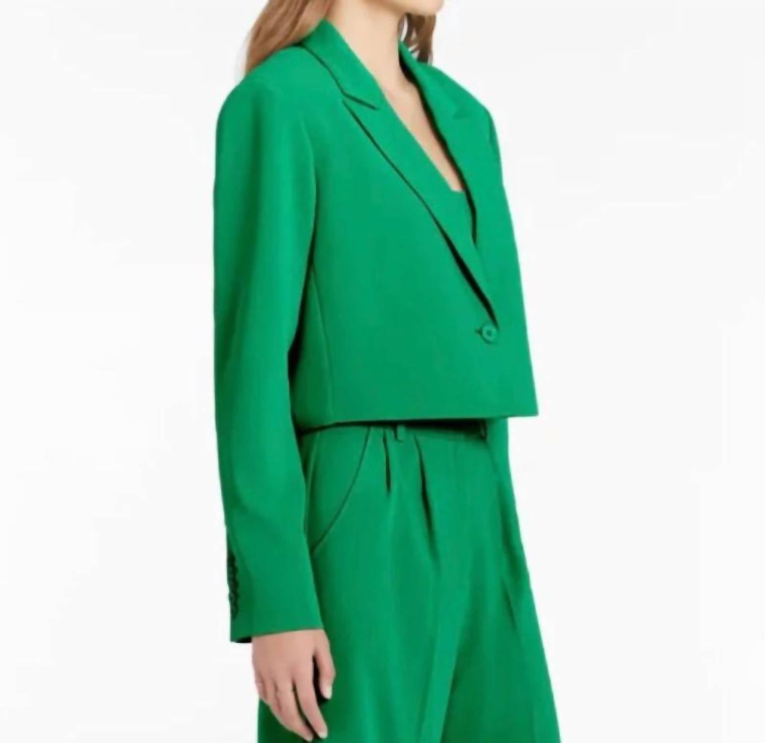 Midweight crepe blazer with a singular front button closure. Features padded shoulders and button cuffs. Dry clean only. 75% Polyester, 19% Viscose, 6% Elastane. Lining: 100% Polyester. Made in the USA.