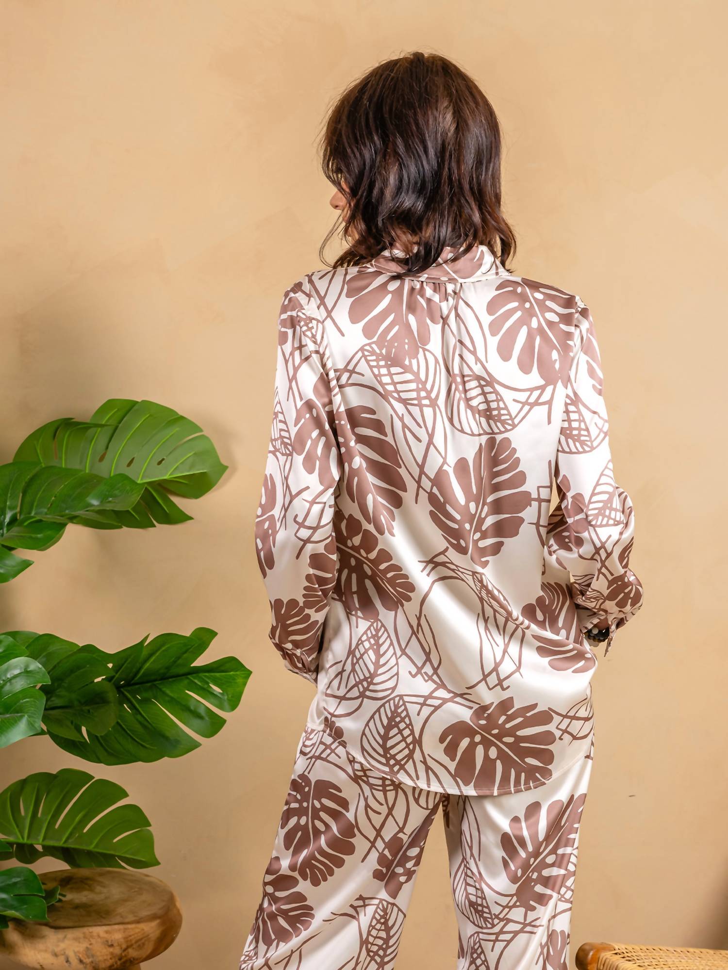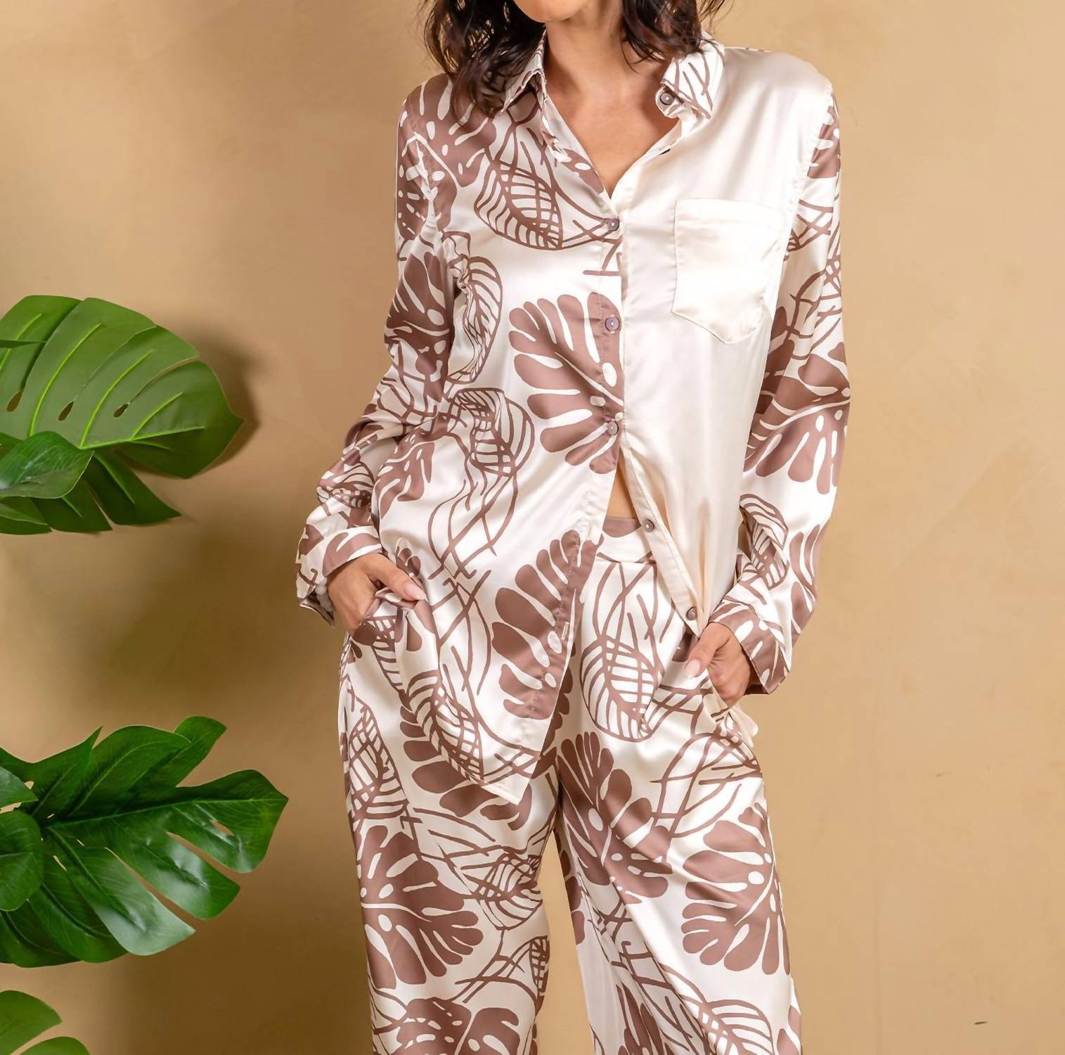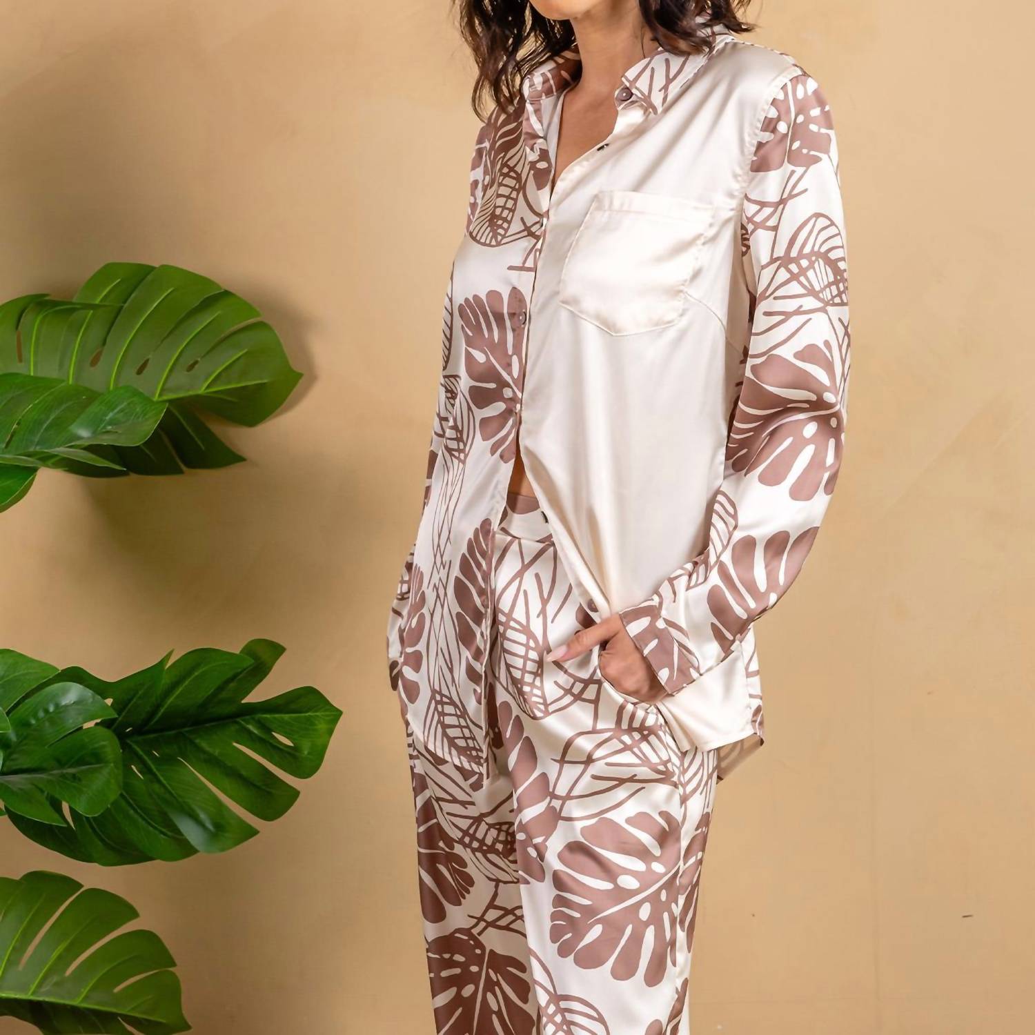 A classic button down shirt that will never go out of style. Elevate your summer wardrobe with the Satin Button Front Mix Shirt by PAPARAZZI, featuring long sleeves and a luxurious satin fabric adorned with a palm print in soft neutrals. This patterned shirt includes a classic collar and a smooth patch pocket that perfectly balance refinement with relaxation. Made from 100% polyester with a lining of 97% polyester and 3% spandex, it offers both comfort and style. Closure is easy with its button-front design, and maintenance is simple with machine wash care instructions.