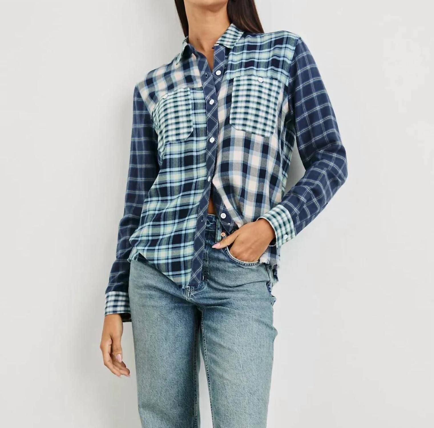 This button down shirt is comfortable yet polished. Chic and charming Sky Navy long sleeve shirt. Features a unique patchwork plaid pattern and two button-closure patch pockets. Made from a blend of 60% Rayon and 40% Cotton. Promises comfort and a soft hand-feel. Care for this imported classic with a hand wash in cold water, and simply hang it to dry.