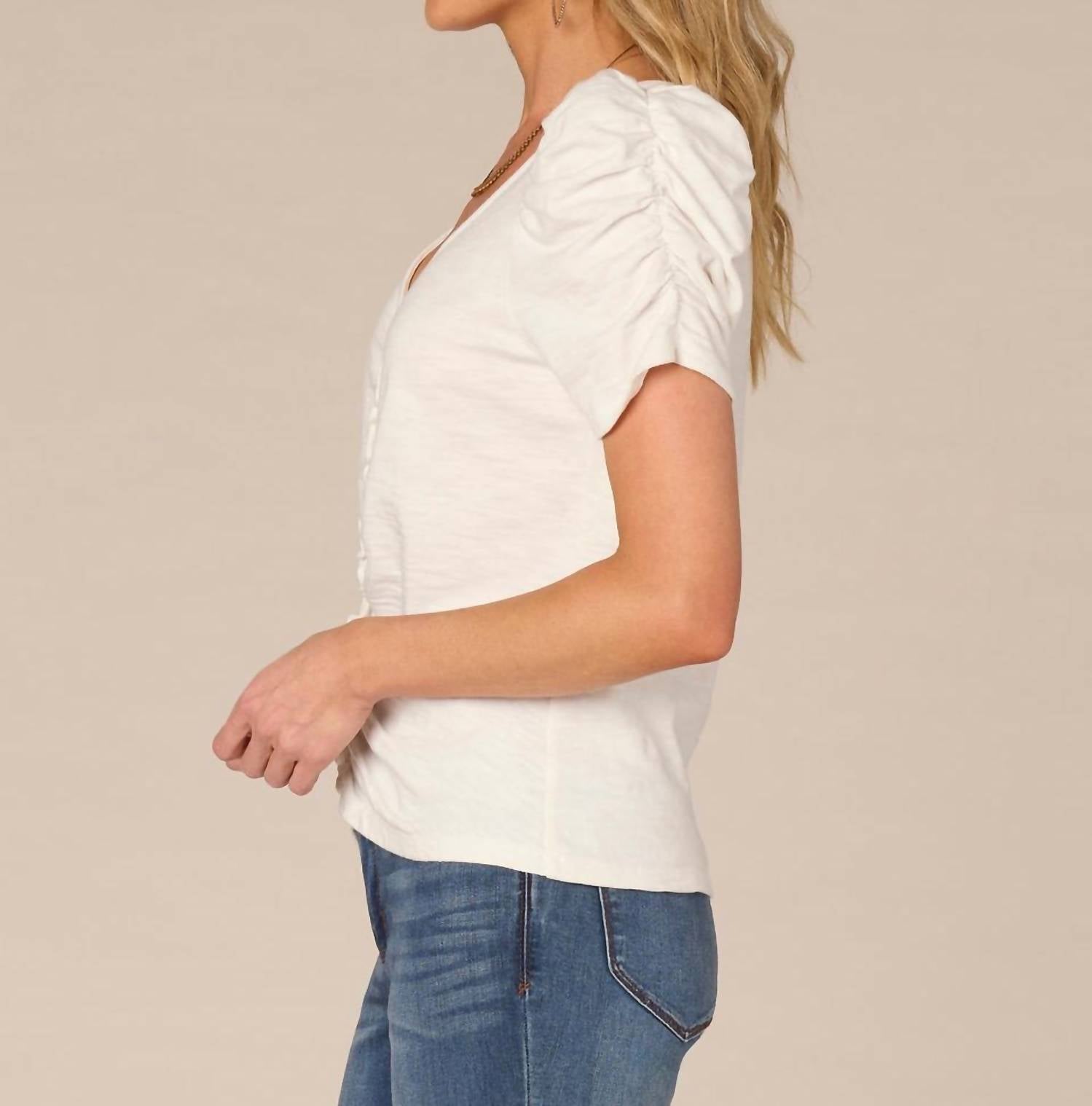 A versatile blouse that works from desk to dinner! Elevate your wardrobe with the Ruched Front Knit Top by Democracy, crafted in 100% cotton for a breathable and comfortable fit. This charming ivory blouse features short shirred puff sleeves and a flattering V-neck, complemented by its playful ruched front and high-low hem. The easy pull-on style makes it perfect for both the office and a dinner party. Care is hassle-free: just machine wash cold and line dry. Lori, at 5'3", models the small for a relaxed fit, but you can size down for a more fitted look.