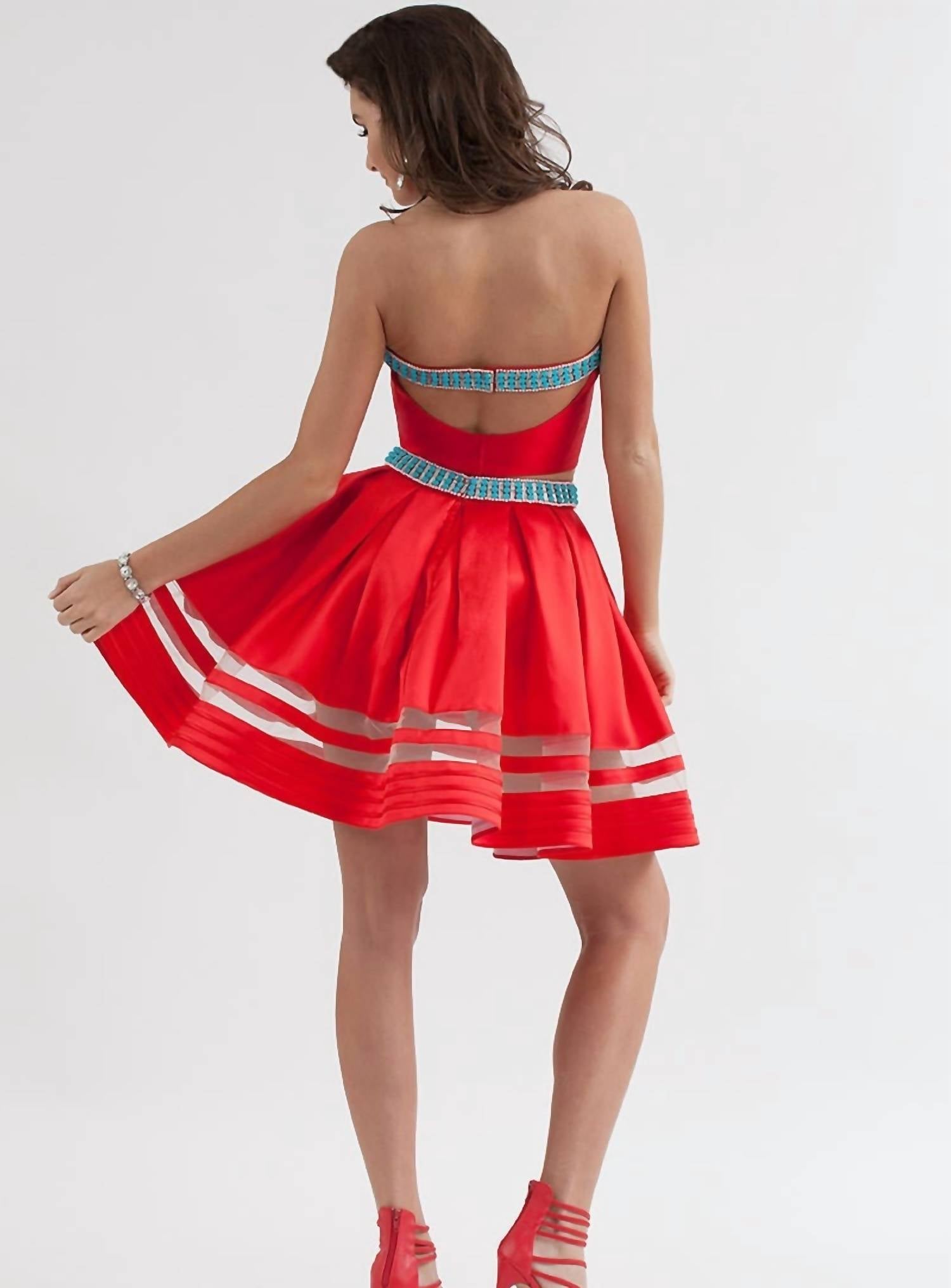 The pefect strapless dress for those warmer months. Add a cardigan for those cooler summer nights. Step into elegance with the Strapless Mikado Two-piece Short Dress by RACHEL ALLAN, tailored for a striking cocktail party look. This alluring A-line dress is detailed with a beaded neckline and waistline, adding a touch of sparkle to the classic red Mikado fabric. The keyhole front enhances its sophisticated allure, while the convenient zip closure ensures a secure fit. Designed with pockets, this piece exudes a timeless appeal perfect for any special occasion.