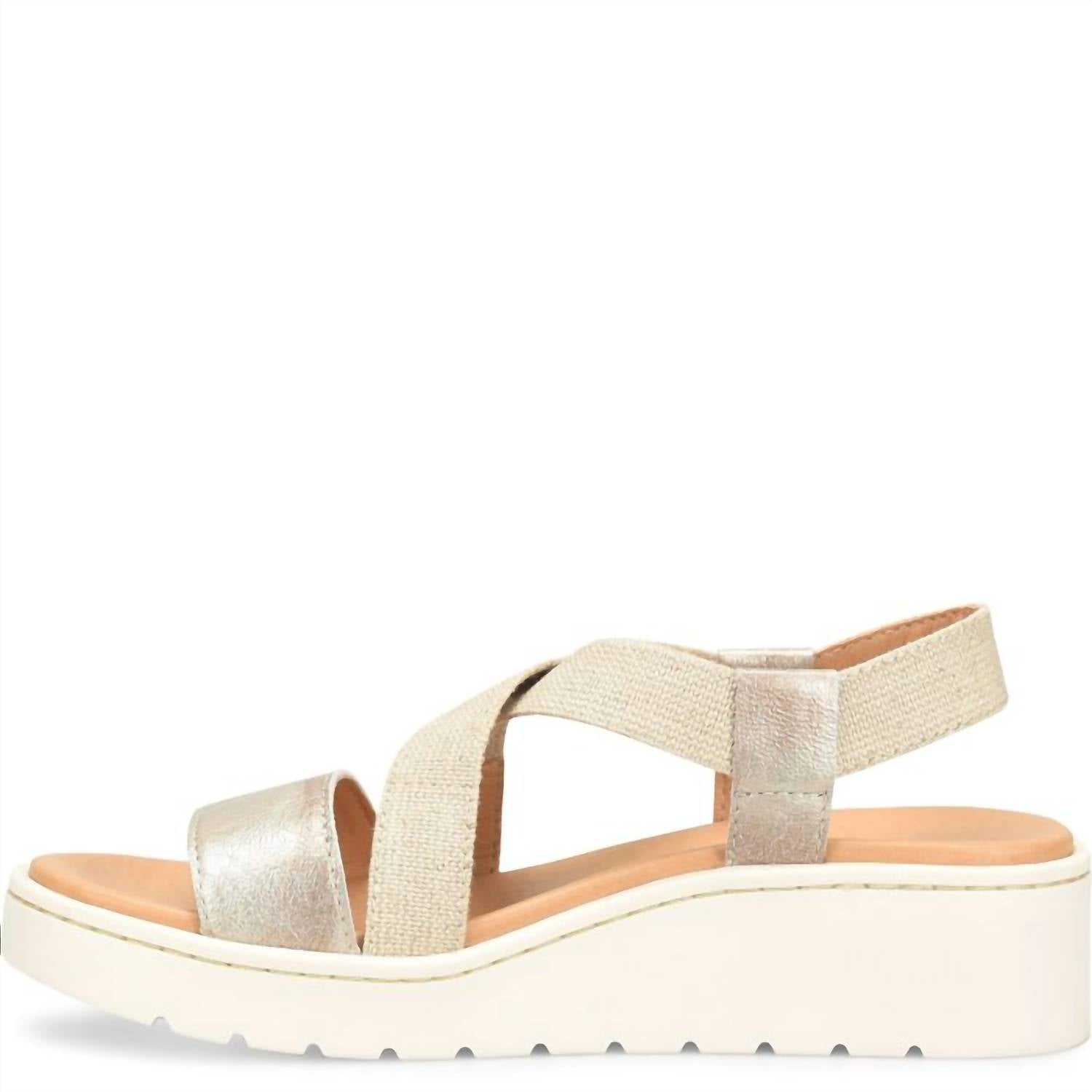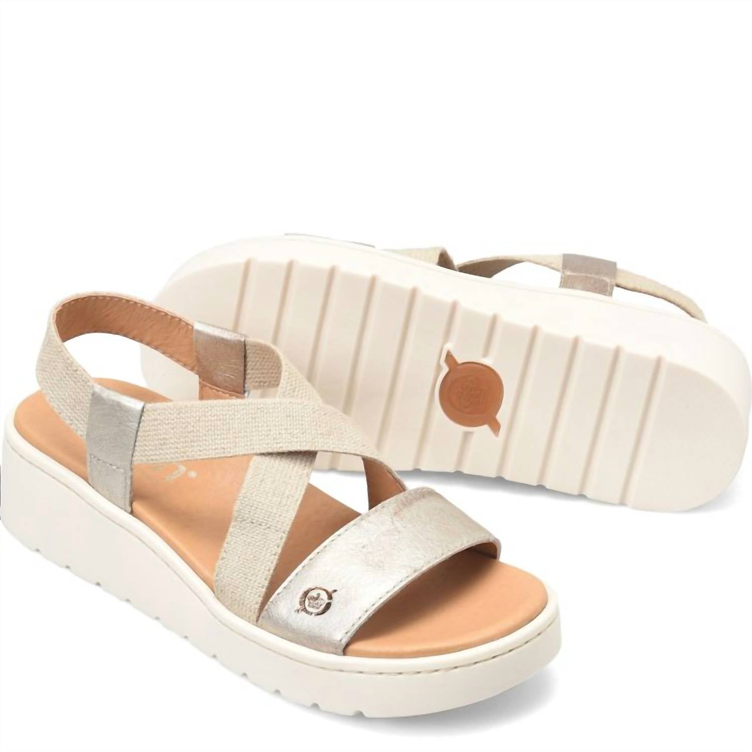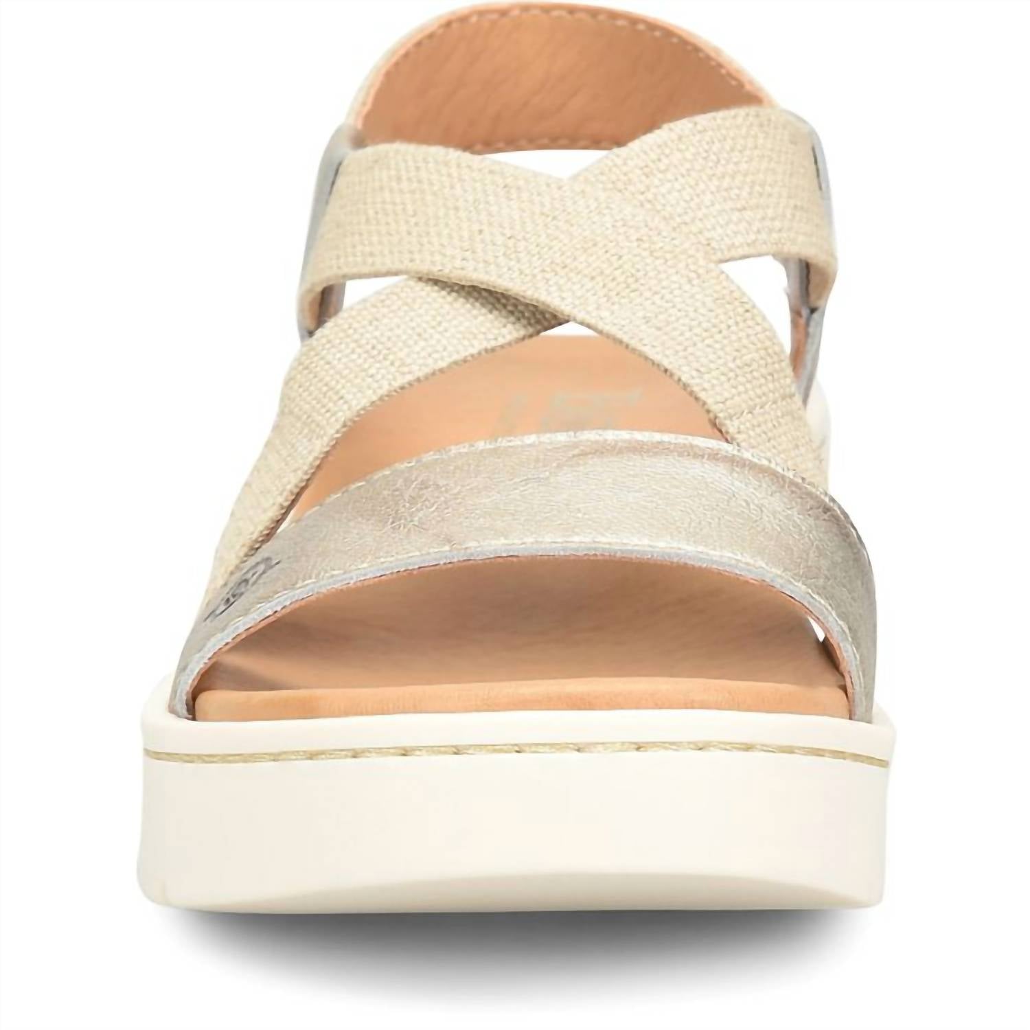 Classicly cute and all-day-wearable. We love this sandal. Step into comfort with the Women's Kasady Metallic Sandal by Born, a perfect vacation companion. Crafted in a luxurious Panna Cotta hue, this summer sandal features an Italian soft hand-finished leather or metallic leather and elastic fabric combo upper. Designed with an open toe and flat heel, it boasts a breathable soft fabric lining and a cushioned fabric-covered footbed with extra foam for added comfort. The high traction, flexible lightweight EVA and rubber combination outsole ensures every step is supported, all in an Opanka handcrafted construction. Enjoy a heel height of 1 3/4 inches and a platform height of 1 inch, making it a minimalist yet stylish choice for women.