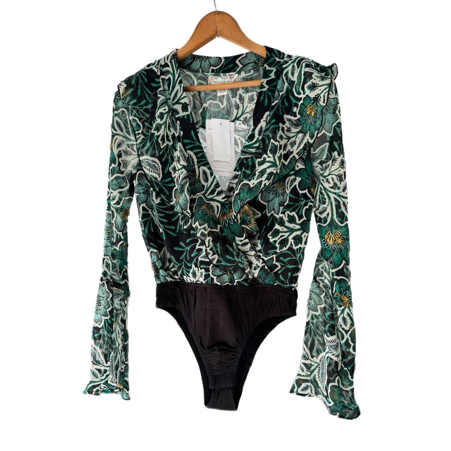 Who doesn't love a good bodysuit? Embrace effortless elegance with the Band of the Free Bonnie Long Sleeve Bodysuit in a captivating emerald hue. With its long sleeves and snap closure, this floral patterned piece offers a seamless pull-on fit, highlighted by a charming V-neckline. Crafted from 100% breathable viscose, this bodysuit promises comfort and style with ruffle accents defining its bohemian flair. For easy maintenance, simply hand wash and line dry.