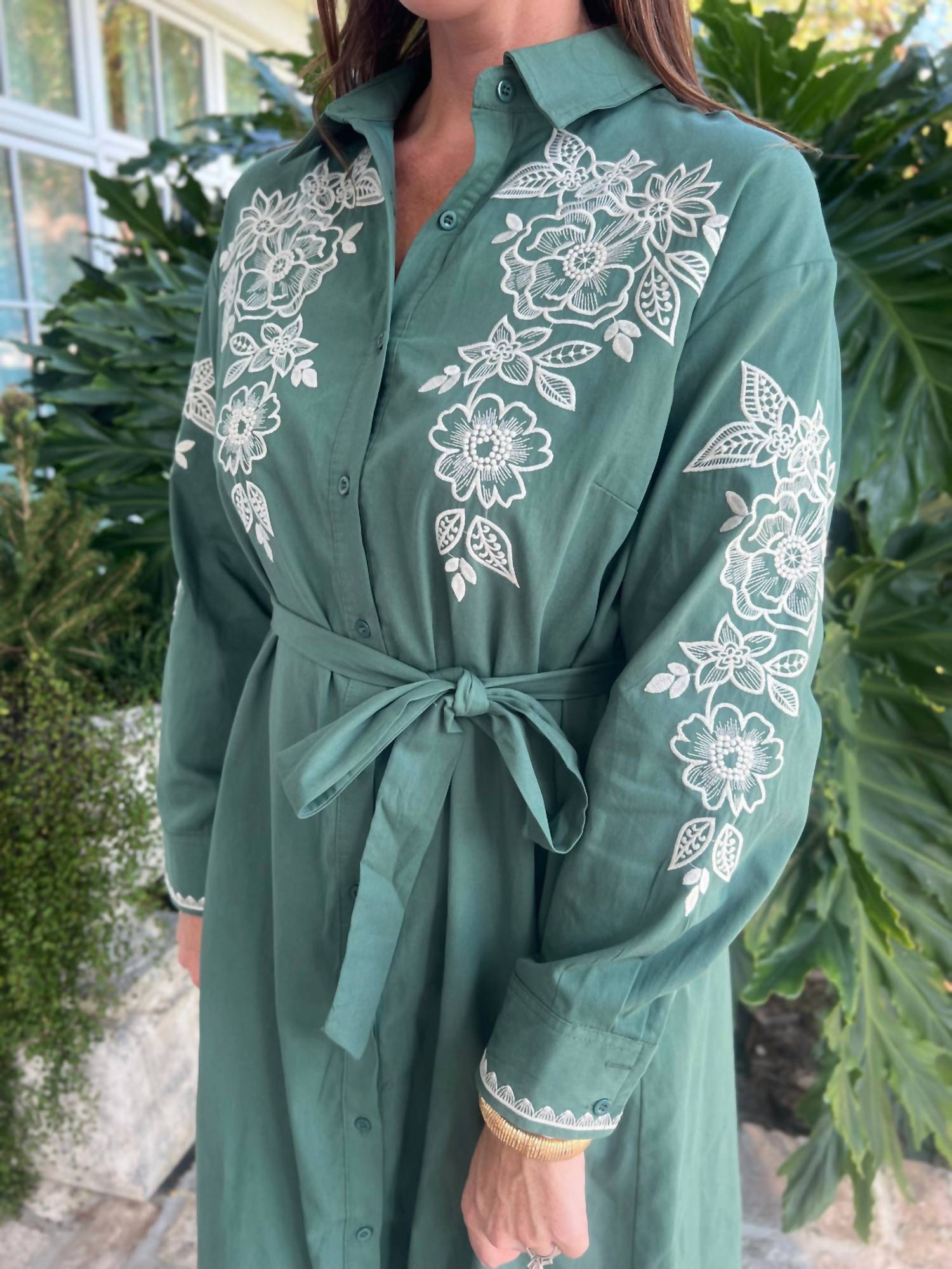 Who doesn't love a good maxi dress? This one you'll be reaching for season after season. Elevate your spring wardrobe with the Saddle Stitch Floral Maxi Dress by &merci, a maximalist statement piece in a rich green hue. This elegant wrap dress features long sleeves and showcases intricate floral embroidery, complemented by a sophisticated collar neckline. Designed without pockets for a streamlined look, it secures with a button closure. Easy to maintain, it's machine washable for your convenience.