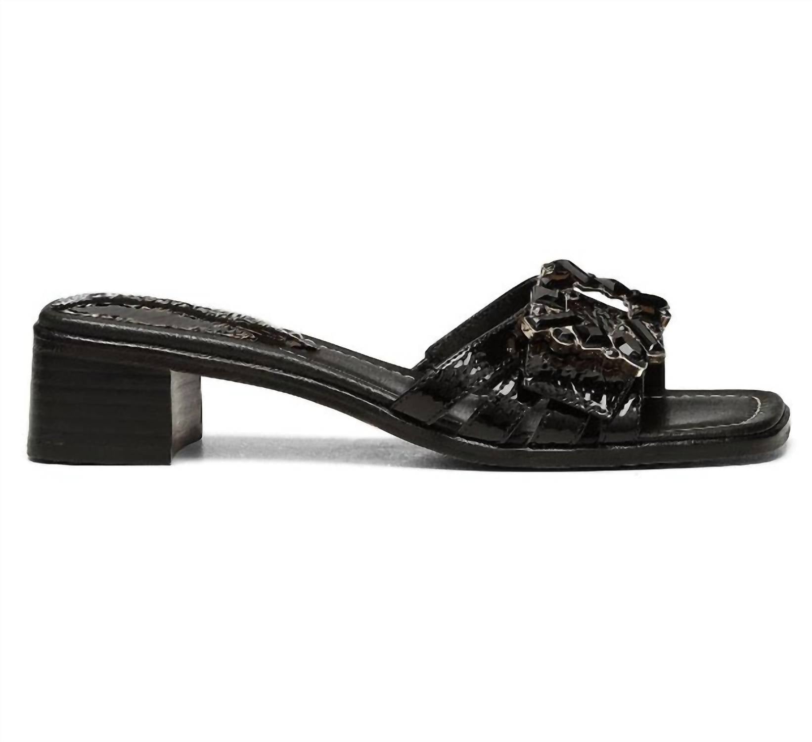 This sandal will take you from brunch to dinner and everything in between. Features a crinkle patent leather upper given a glamorous twist by a jeweled ornament. Lined with soft leather and memory foam padding. Low stacked heel with a buffed leather and rubber outsole, this square-toe style.  1 1⁄2 Heel height.