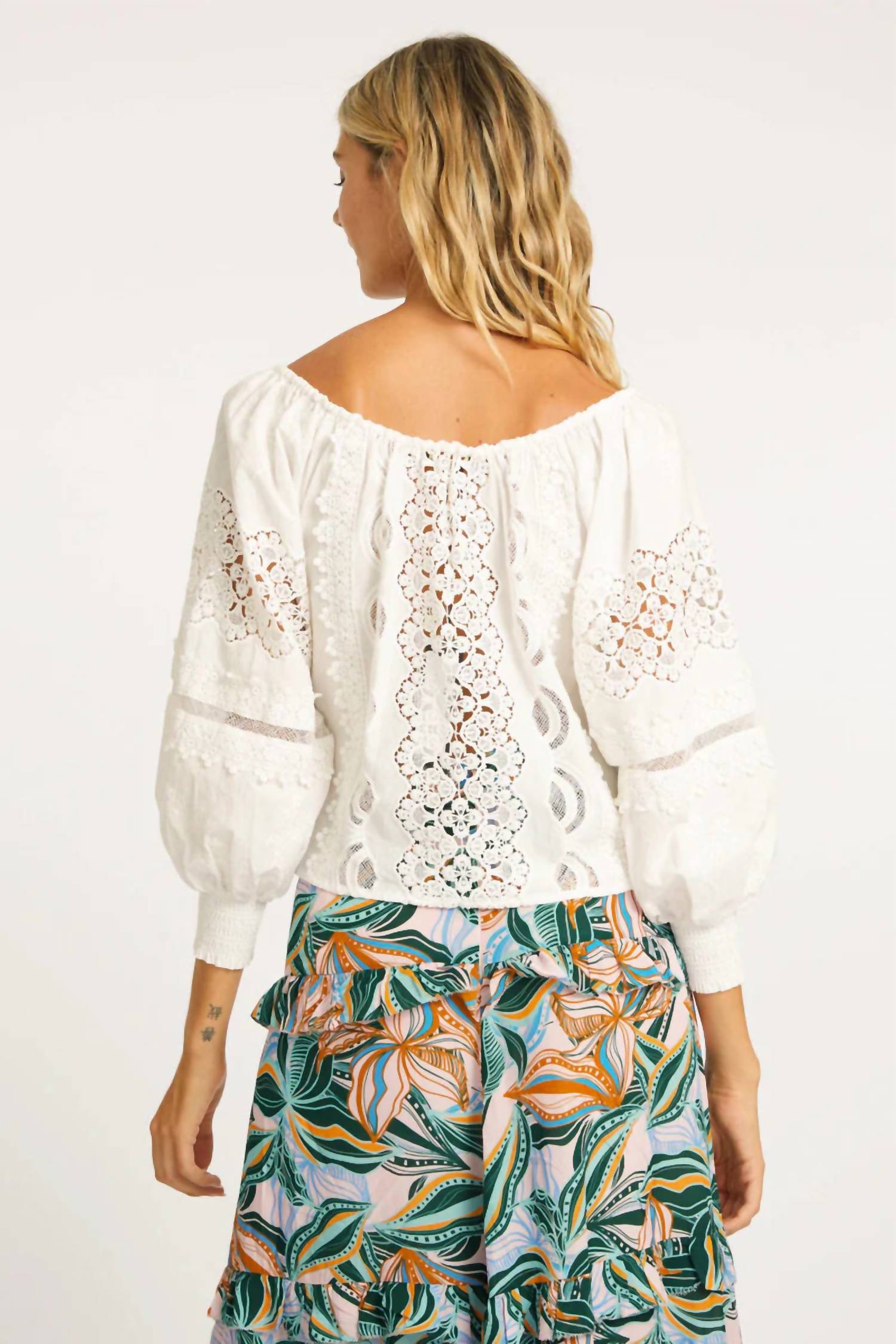 A timeless blouse that will never go out of style. The Sybille Top in Ivory by CABALLERO offers a perfect blend of elegance and comfort, enhancing your spring wardrobe. This women's blouse features long, airy blouson sleeves with a textured lace pattern along the body, completed by smocked cuffs for a romantic touch. Crafted from 100% soft cotton, its pull-on design is accentuated by a V-neckline with a button-and-loop closure for versatile styling. The Sybille Top is perfect for both casual outings and holiday parties, making it a chic and flexible addition to any wardrobe.