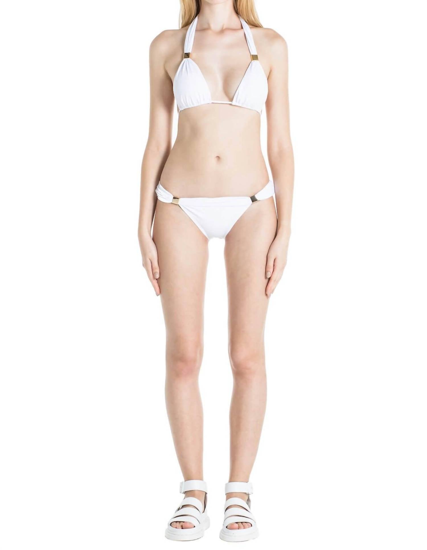 Discover timeless elegance with the Nina Halter Bikini Top by Sauipe, in a pristine white hue. This classic bikini features a hypoallergenic gold clasp and is crafted from 87% polyamide and 13% spandex, ensuring it maintains its silky texture and bright white color through seasons of wear. Made in Brazil, it offers double lining for additional coverage, even when wet. Customize your look by removing the gold-tone hardware to create a chic knot for an alternative style.