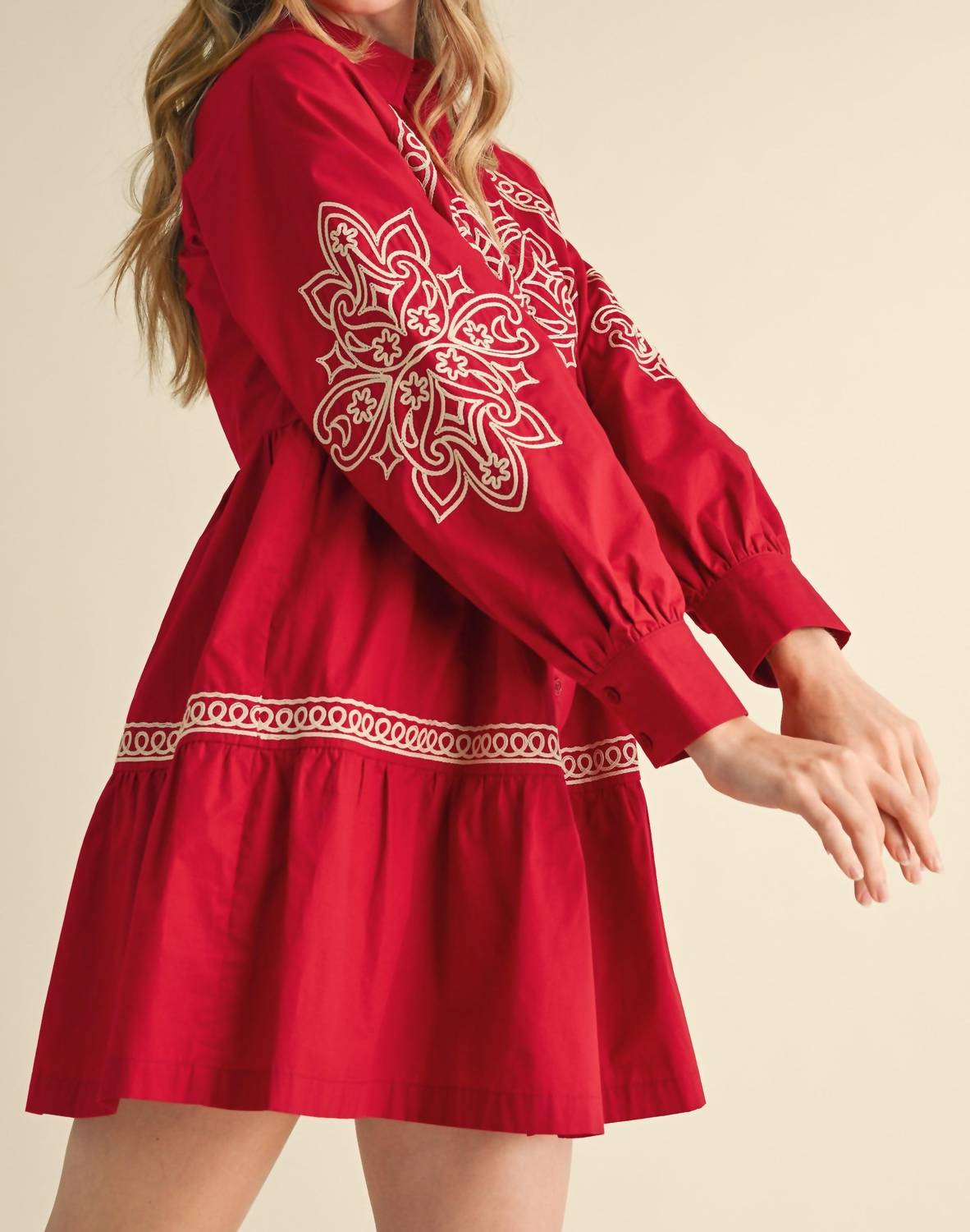 A short and breezy dress for those warmer days. Introducing the Reba Embroidered Button Down Mini Dress by &merci, a stunning addition to any wardrobe with its luxurious embroidered detailing. This exquisite dress features long puff sleeves and a collared neckline, crafted from 100% cotton for both comfort and elegance. Though it carries a shirt silhouette, its button closure adds a classic touch. Perfect for any occasion, this red floral-patterned mini dress promises to turn heads.