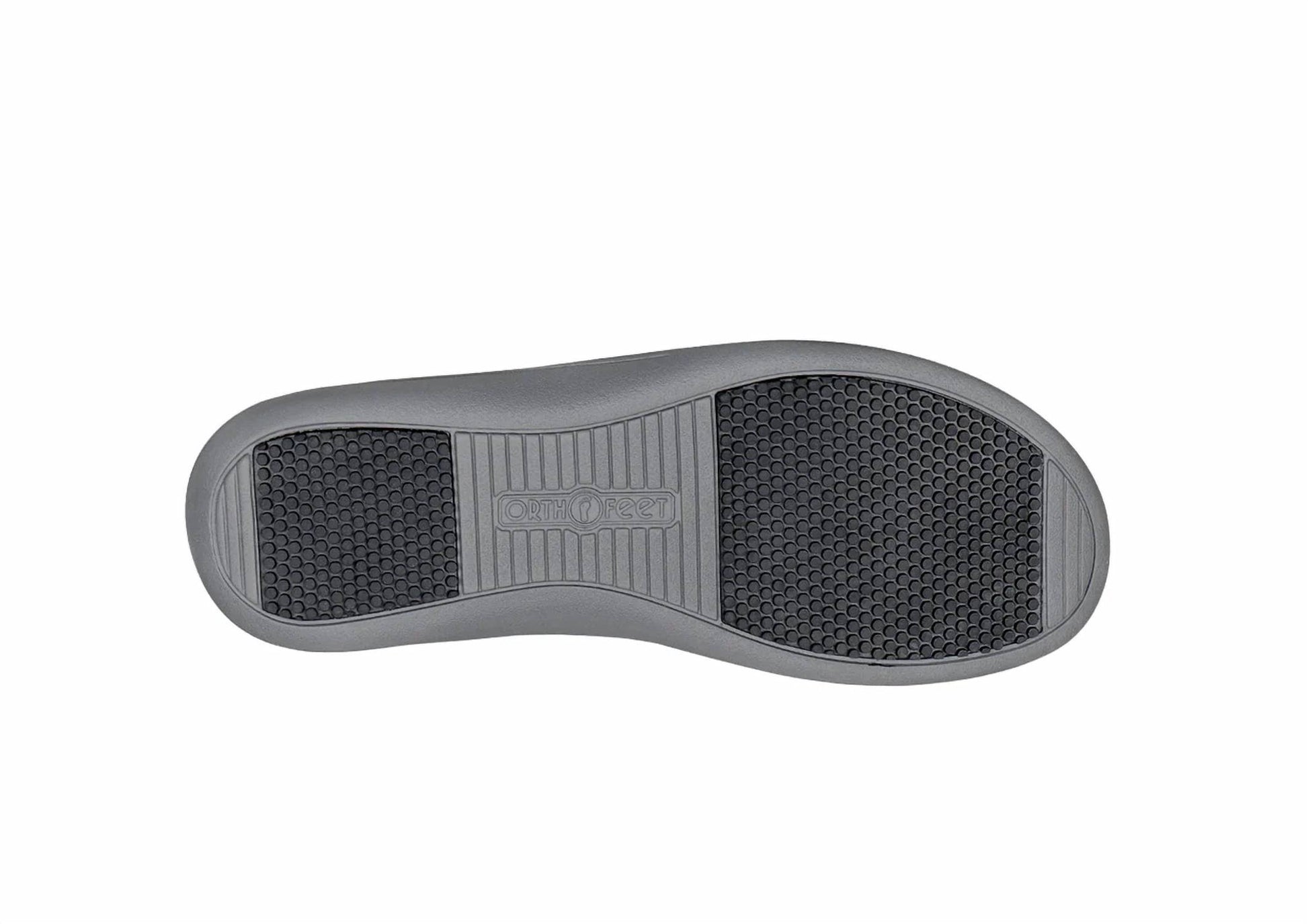 Classicly cute and all-day-wearable. We love this sandal. Step into exceptional comfort with the Women's Hydra Sandal by Orthofeet, crafted for unparalleled ease. Featuring a soft leather upper in sophisticated grey and a Two-Way strap system for effortless wear, these sandals are your perfect summer companions. Designed with premium orthotic insoles, anatomical arch support, and an Arch Booster, they help alleviate foot pain and plantar fasciitis. The flat heel pairs with a cushioning sole and mild rocker design, ensuring a smooth walking experience, while the rubber outsole delivers excellent grip.