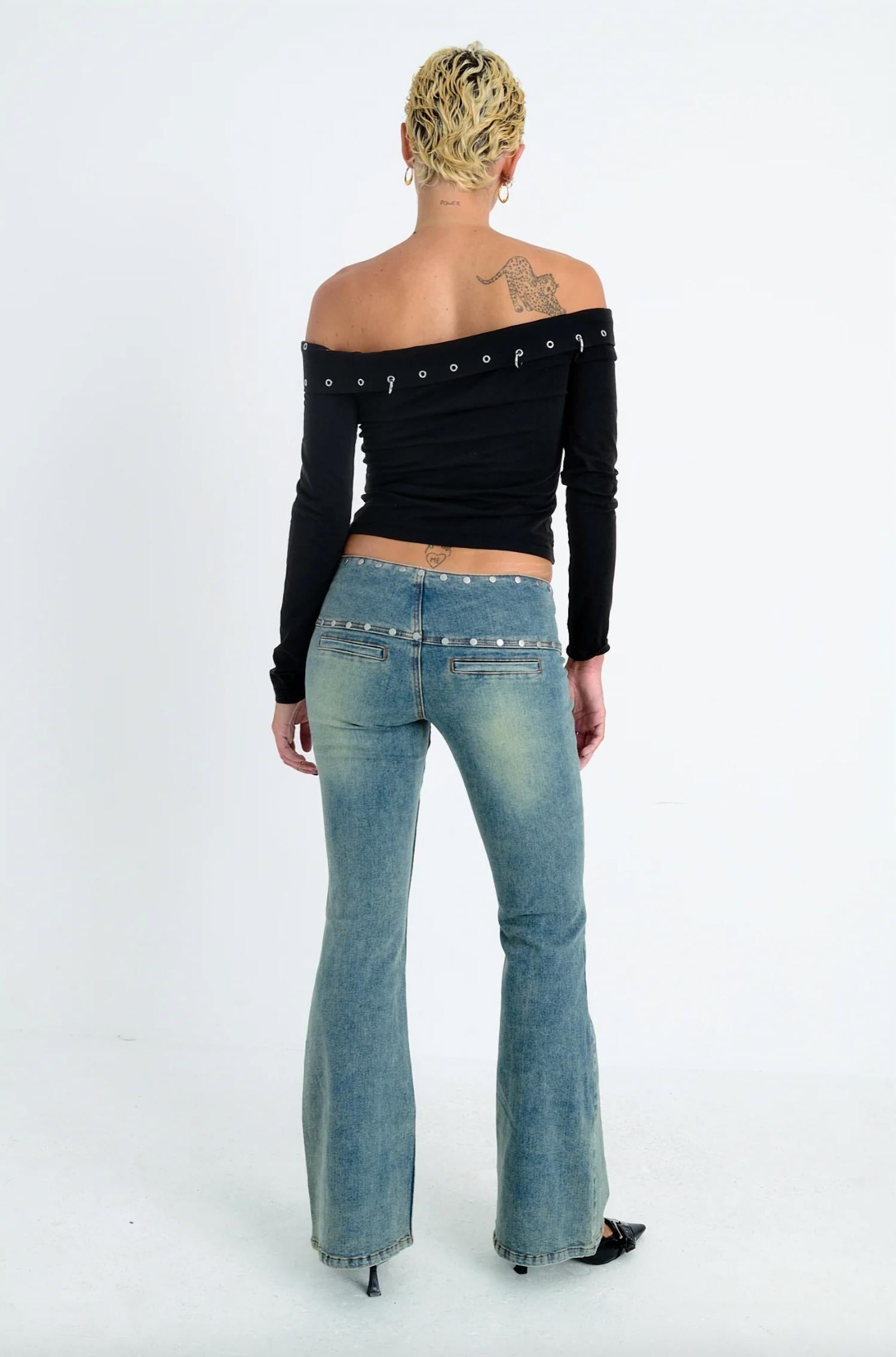 If you're looking for boot-cut, this is the jean for you. Add a touch of edge to your wardrobe with the Charlotte Bootcut Jean by The Ragged Priest, crafted from dirty wash blue denim for an eye-catching look. These jeans feature a flared fit and a unique buckle belt, while the signature cross-stitch on the back pockets adds playful style. The composition is a comfortable 72% Cotton, 26% Polyester, and 2% Spandex blend, offering a slight stretch for the perfect fit. Machine wash according to instructions on the care label to maintain their bold appeal. Model is wearing a size 28 and stands 5'9" tall.