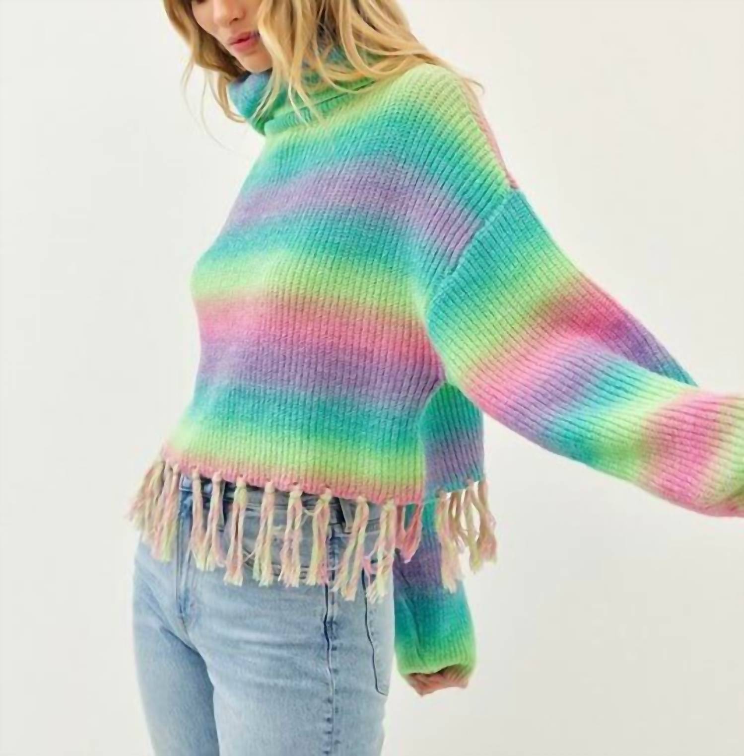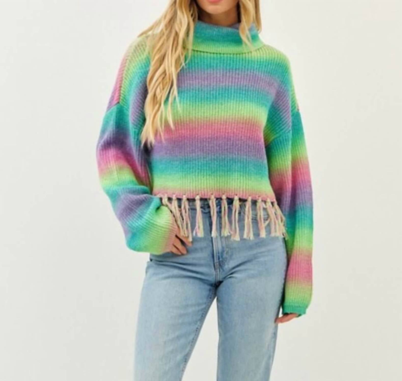 Experience the perfect blend of comfort and style with this trendy crew neck sweater, designed to effortlessly elevate your wardrobe. Pair it with your favorite denim and loafers for the perfect look. Introducing the Addie Colorful Striped Sweater With Fringe by Idem Ditto, a vibrant piece perfect for making a statement. This women's turtleneck sweater features long sleeves and a playful rainbow-striped pattern. Composed of 60% Polyester and 40% Acrylic, it ensures a true-to-size fit. With a trendy cropped design, it's a pull-on style that adds a pop of color to any outfit. Care: Machine wash. Available in sizes Small, Medium, and Large.