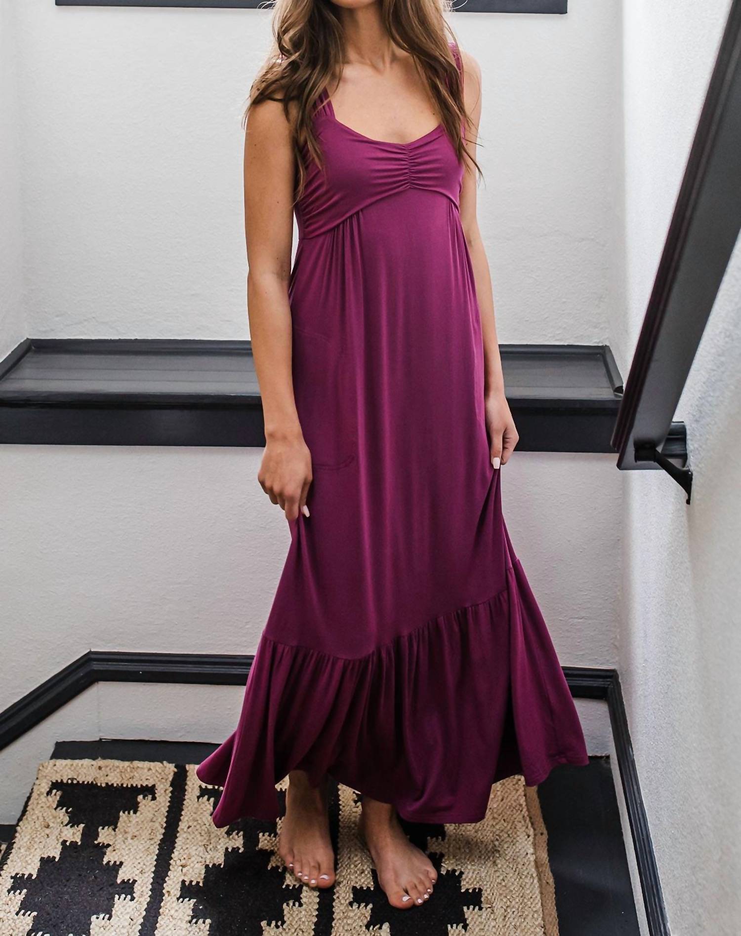 A maxi dress that is just as cute as it is comfortable. Step into effortless elegance with the Cleo Babydoll Bamboo Maxi Dress by Yala in a captivating Boysenberry shade. This sleeveless A-line silhouette features wide straps and a flattering empire waist, enhanced by playful pockets and an oversized ruffle detail from the knee down. Made from a luxurious blend of 95% USDA Certified Organic Bamboo Viscose and 5% Spandex, this dress offers supreme softness and breathability. Closure: Pull-on style. Perfect for spring holiday parties, it's both Oeko-Tex 100 Certified and machine washable.