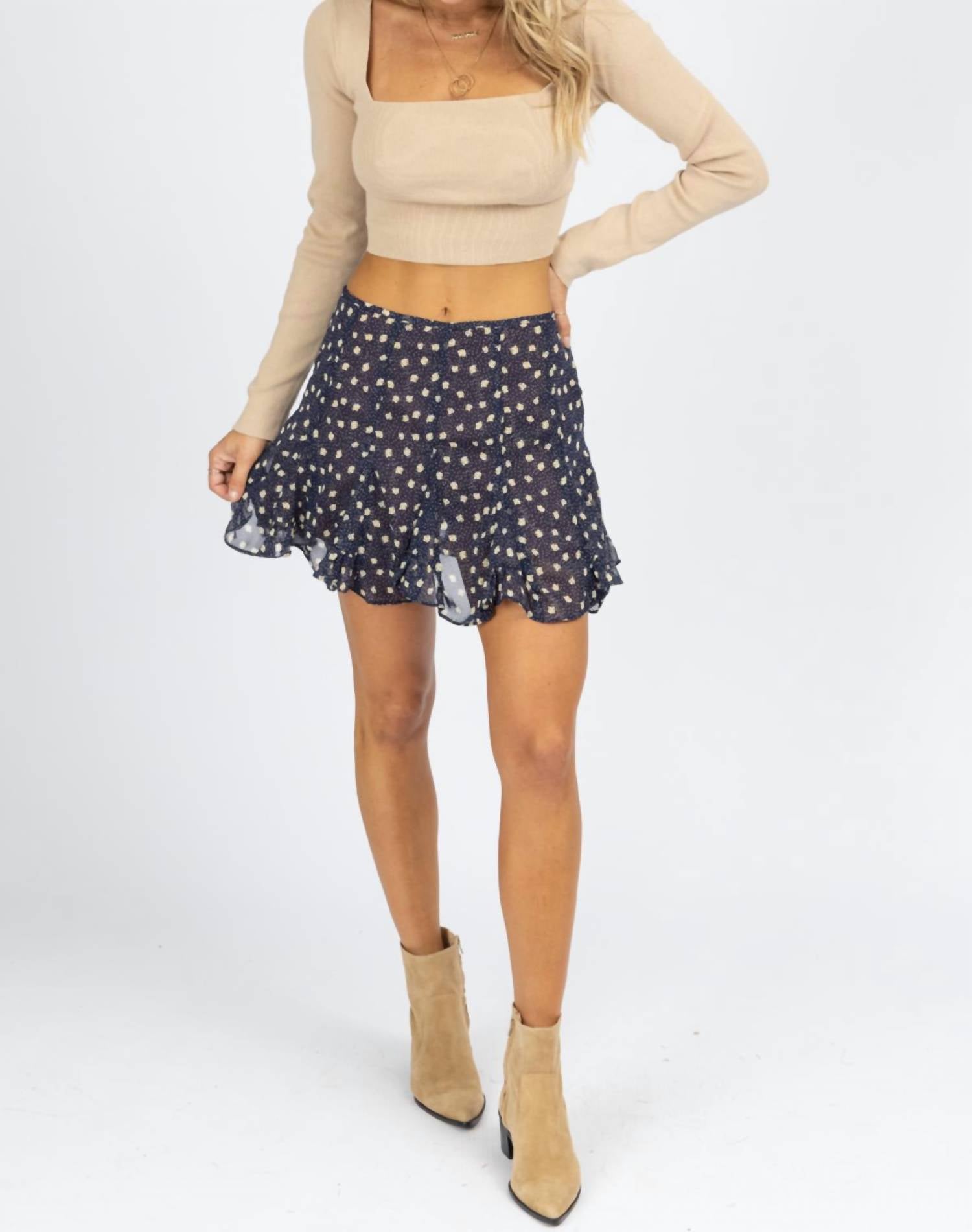 High-waisted, fit with a slight flare, floral print, zippered. 100% polyester. The model is wearing a size small. Height 5'8.