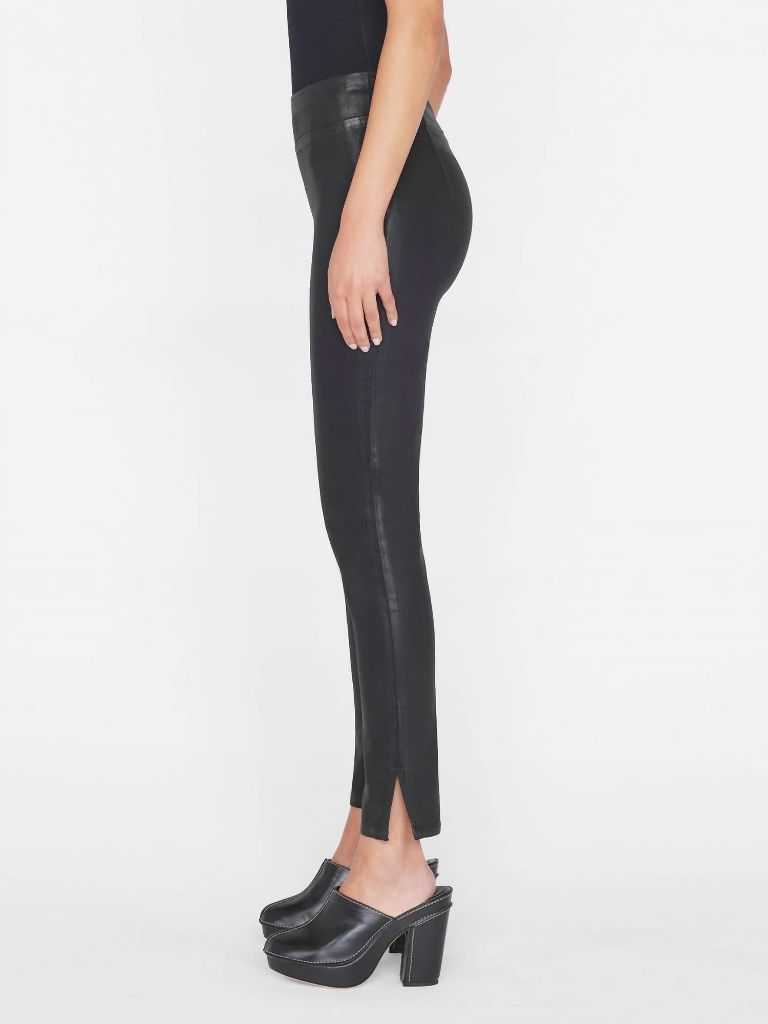 The perfect skinny pant for those stylish boots this season! Introducing the Frame Women's The Jetset Skinny Crop Jean in Noir Coated, designed for fashionable comfort on the go. Featuring a high rise of 10 inches and a pull-on elastic waistband, these jeans offer a slim fit with a no-pocket, skinny leg silhouette enhanced by a 27-inch inseam and side ankle slit. Made from coated super stretch denim comprising 32% Cotton, 20% Recycled Cotton, 38% Lyocell, 5% Recycled Polyester, and 5% Elastane, this piece ensures excellent shape recovery. Care: Dry clean only. Model is wearing size 1 (5'8" height, 32C bust, 24" waist, 34" hips, dress size 0-2 US).