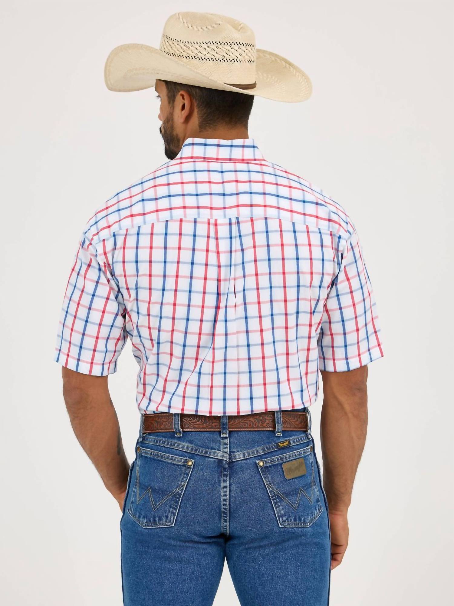 Introducing the Wrangler Men's Classic Plaid Shirt from the George Strait Collection, a perfect blend of style and comfort for the modern man. Designed with short sleeves and crafted from a breathable fabric blend of 98% Cotton and 2% Spandex, this shirt offers both flexibility and durability. Made in the USA or imported, it features a classic button closure for easy wear. Caring for this plaid and check patterned shirt is simple with machine wash and tumble dry instructions.