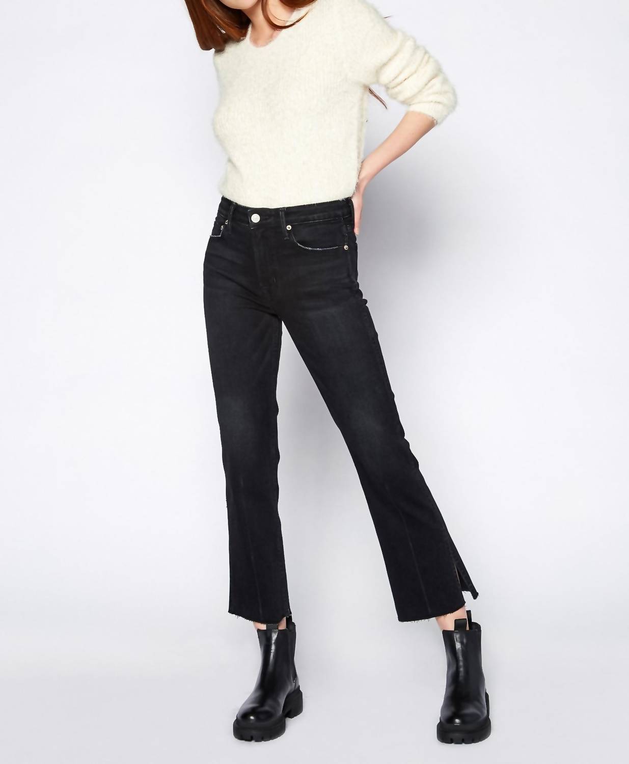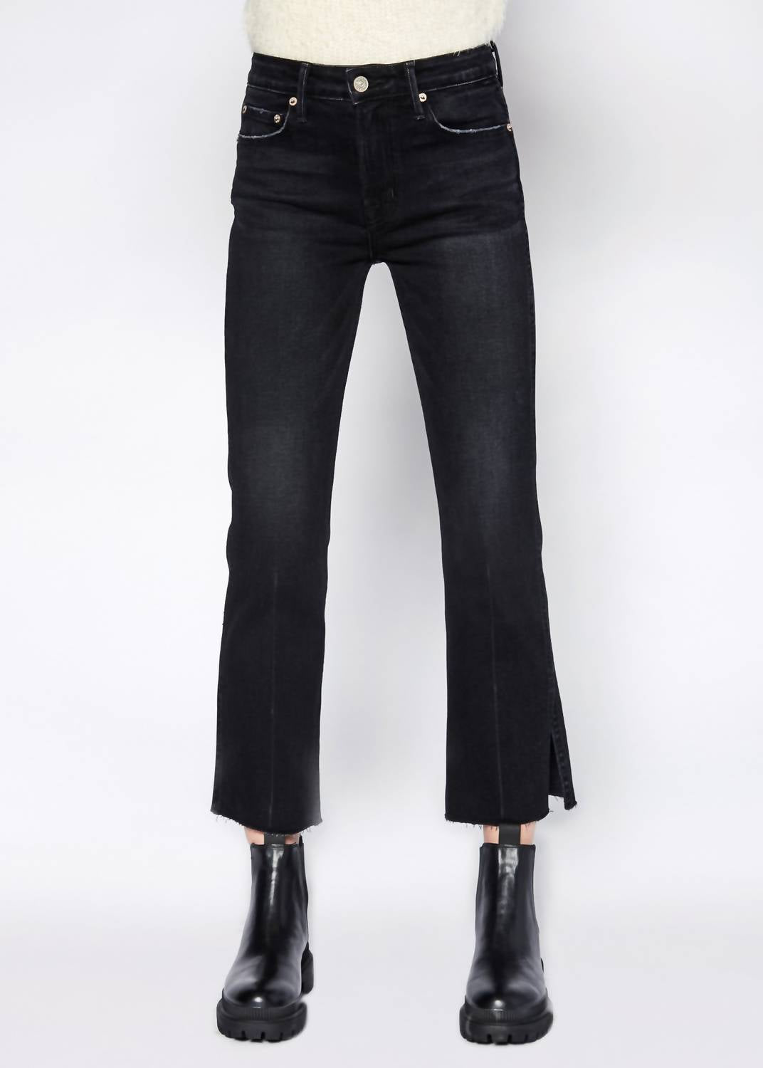 Kick flare with cutoff hem and side slit These classic jeans provide a timeless look and feel, perfect for any event or occasion. They are carefully tailored for a flattering fit that flatters all body types. Model is 5'10" wearing size 26. Approx. Rise: 10" Inseam: 27". Approx. Knee: 14 1/2" Leg Opening: 16". 99% Cotton, 1% Lycra. Made in USA. Fits true to size.