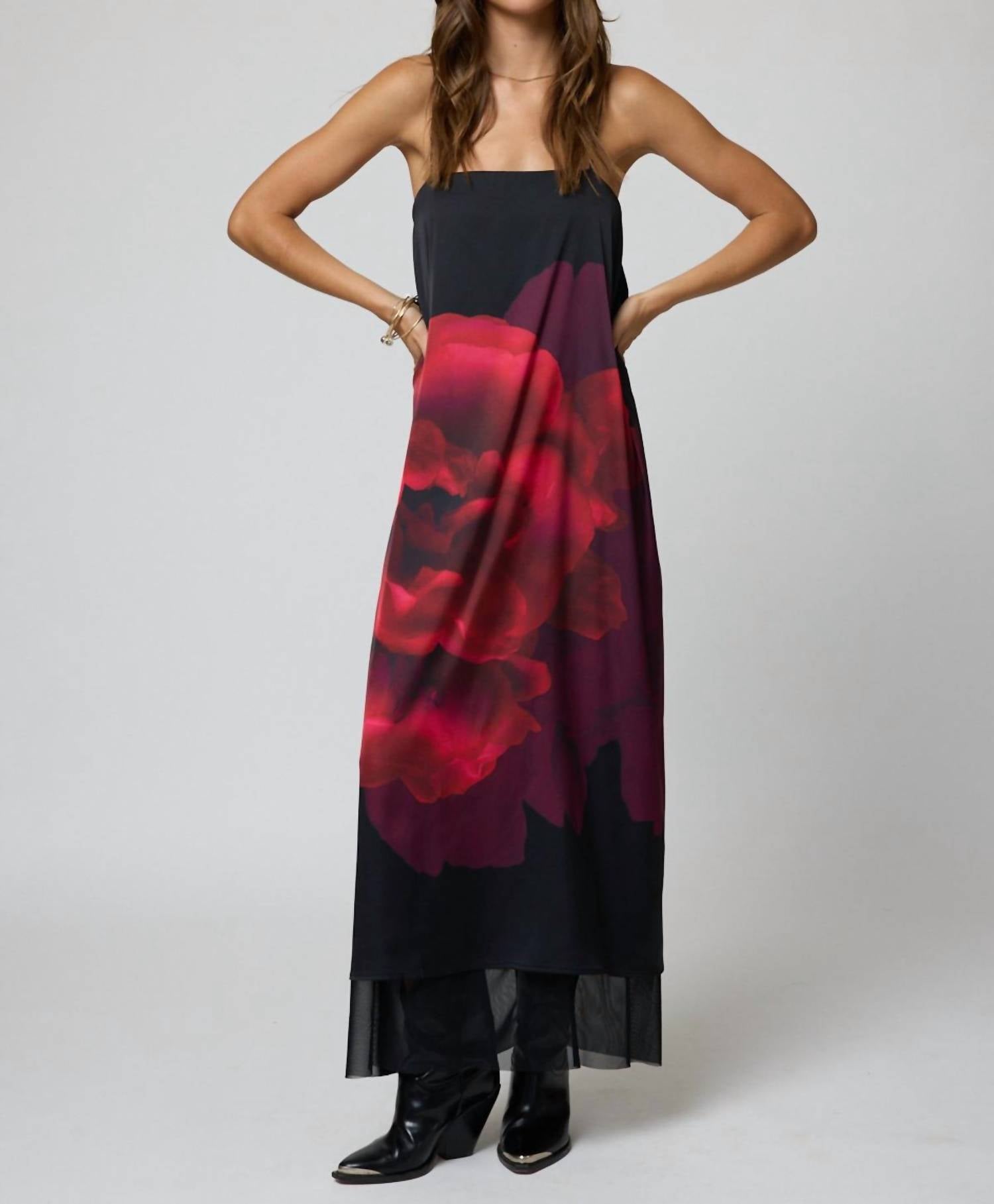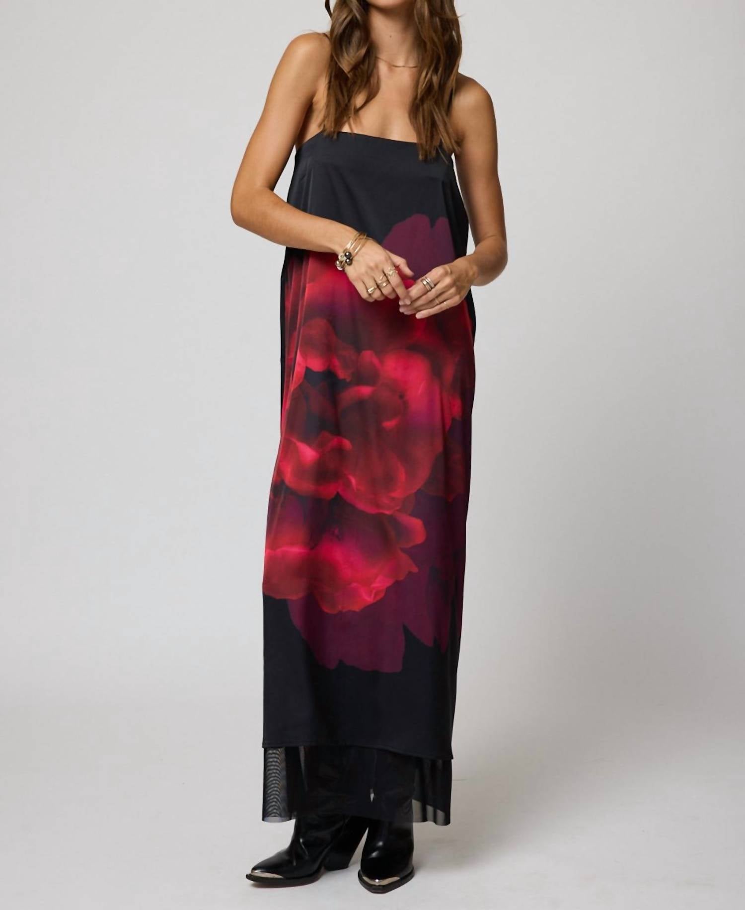 Style this maxi with your favorite statement necklace and sandals for the perfect look. Meet the Catalina Maxi Dress by Stillwater, a stunning piece in the captivating Midnight Rose floral pattern, exuding quiet luxury. This dress features spaghetti straps and a square neckline, made from 97% dull satin poly and 3% spandex for a comfortable fit. Designed with a sophisticated slip silhouette, it offers a mesh underskirt for an elegant touch. Pull on. Dry clean only.
