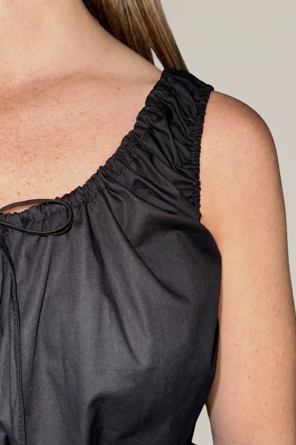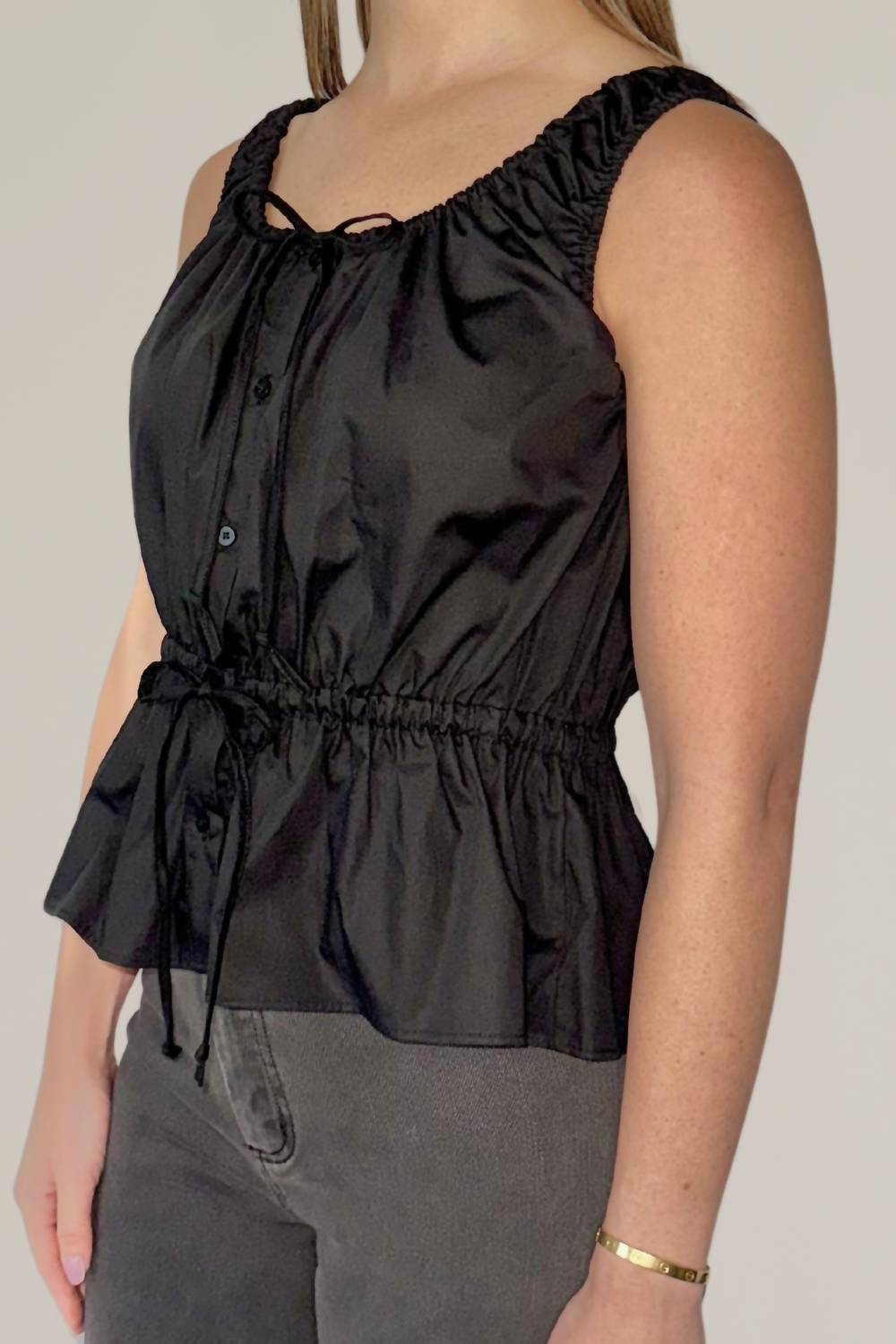 Introducing the Peplum Tank Top by MOD REF, a summer staple with a feminine flair. This sleeveless, solid black tank features charming front tie bows and a squareneck neckline. Crafted from 100% cotton, it ensures comfort and breathability. The button closure allows for easy wear, and it is best maintained with hand washing, line drying, and a cool iron. Model is wearing a size small.